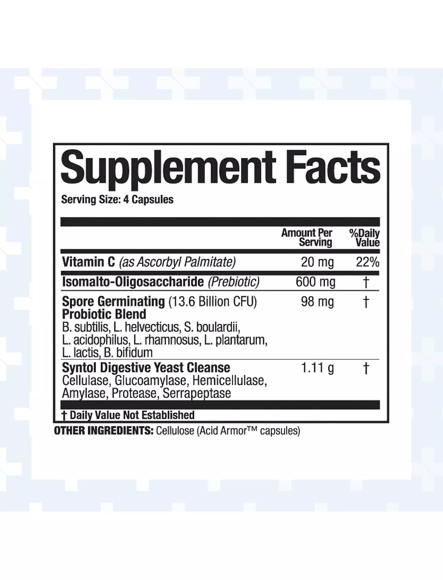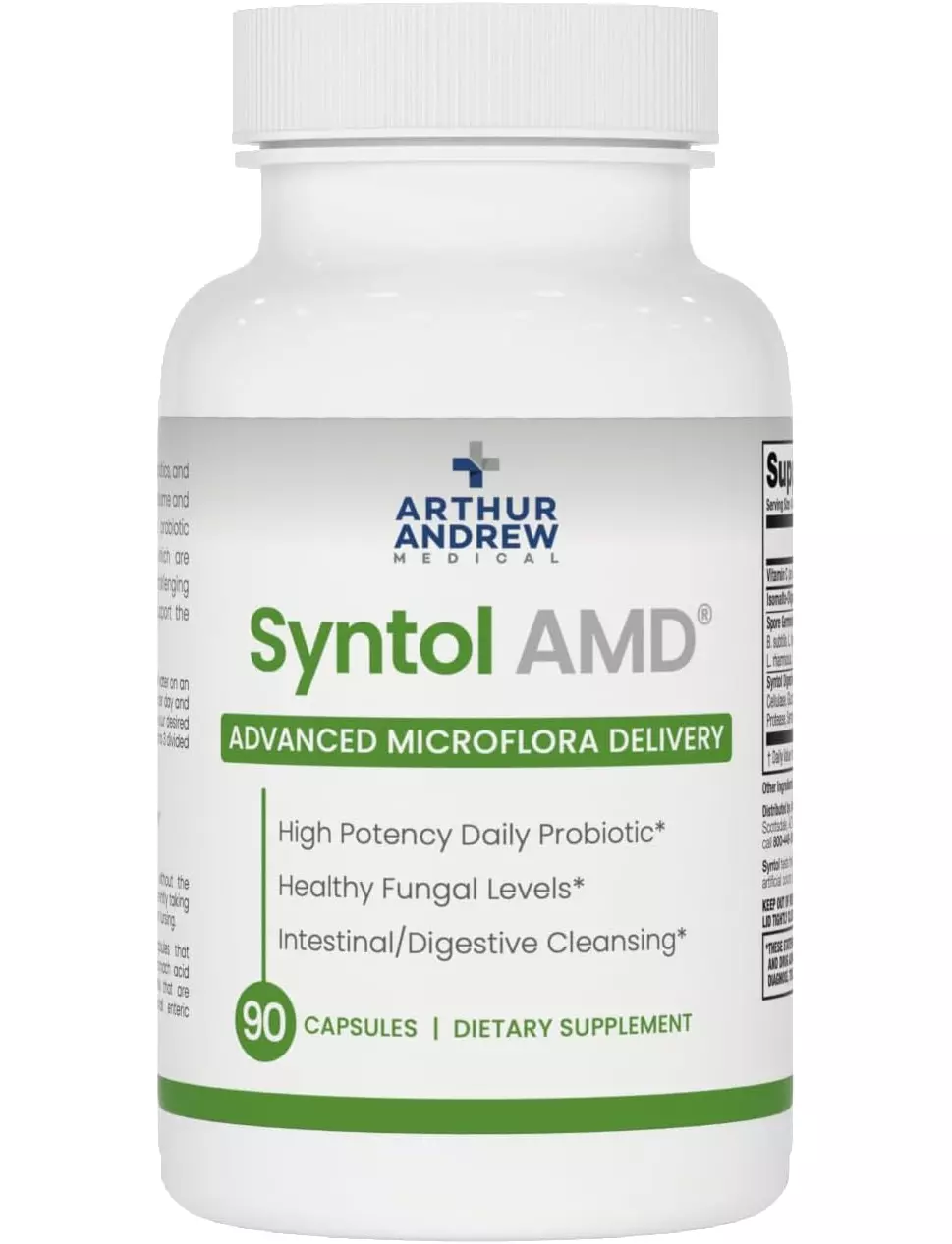 Syntol містить 13,6 мільярдів колонієутворювальних одиниць (КОЕ) комплементальної мікрофлори та спороутворювальних пробіотиків на дозу. Для стимуляції росту й активності пробіотиків як пребіотика була додана ІМО, непереварювана клітковина, отримана з ГМО тапіокі, що не містить ГМО. Крім корисної мікрофлори, Syntol також містить потужну суміш ферментів, призначену для видалення дріжджів та іншого небажаного сміття з кишкового тракту, що робить Syntol найкращим засобом для очищення від дріжджів, представлених на ринку.