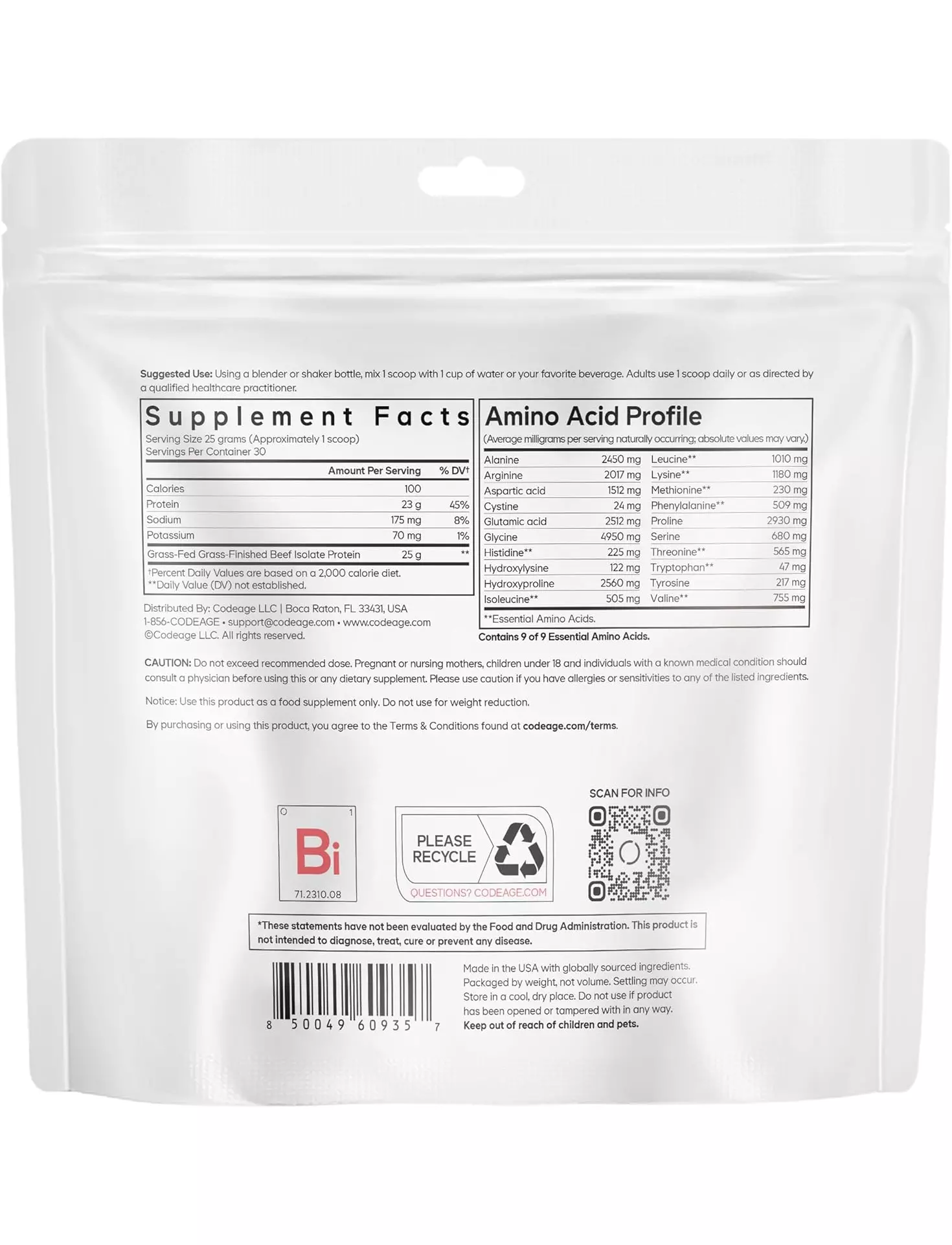 Codeage Beef Isolate Protein — це чиста формула, отримана з яловичини трав'яної відгодівлі. Цей преміальний порошок протеїну без ароматизаторів і підсолоджувачів містить 20 амінокислот на порцію, включаючи всі дев'ять незамінних амінокислот.