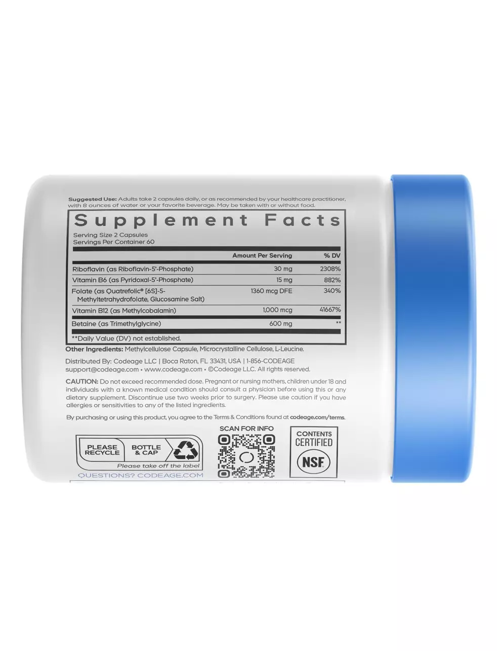 Ця вдосконалена формула також містить рибофлавін (30 мг рибофлавін-5'-фосфату - вітамін Б2), 15 мг вітаміну Б6 і 1000 мкг метилкобаламіну вітаміну Б12 на порцію. Ці вітаміни Б2, Б6 та Б12 можуть допомогти забезпечити комплексну підтримку вітаміну B та стимулювати цикл метилювання.