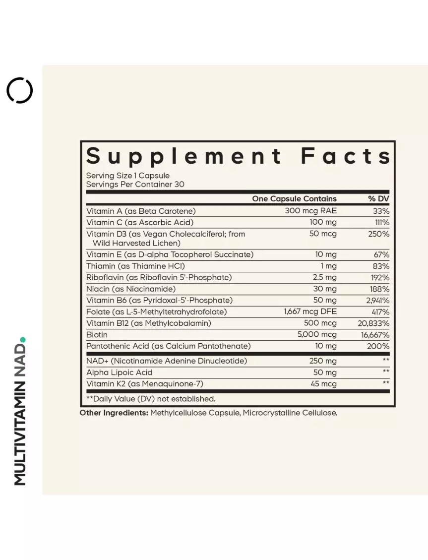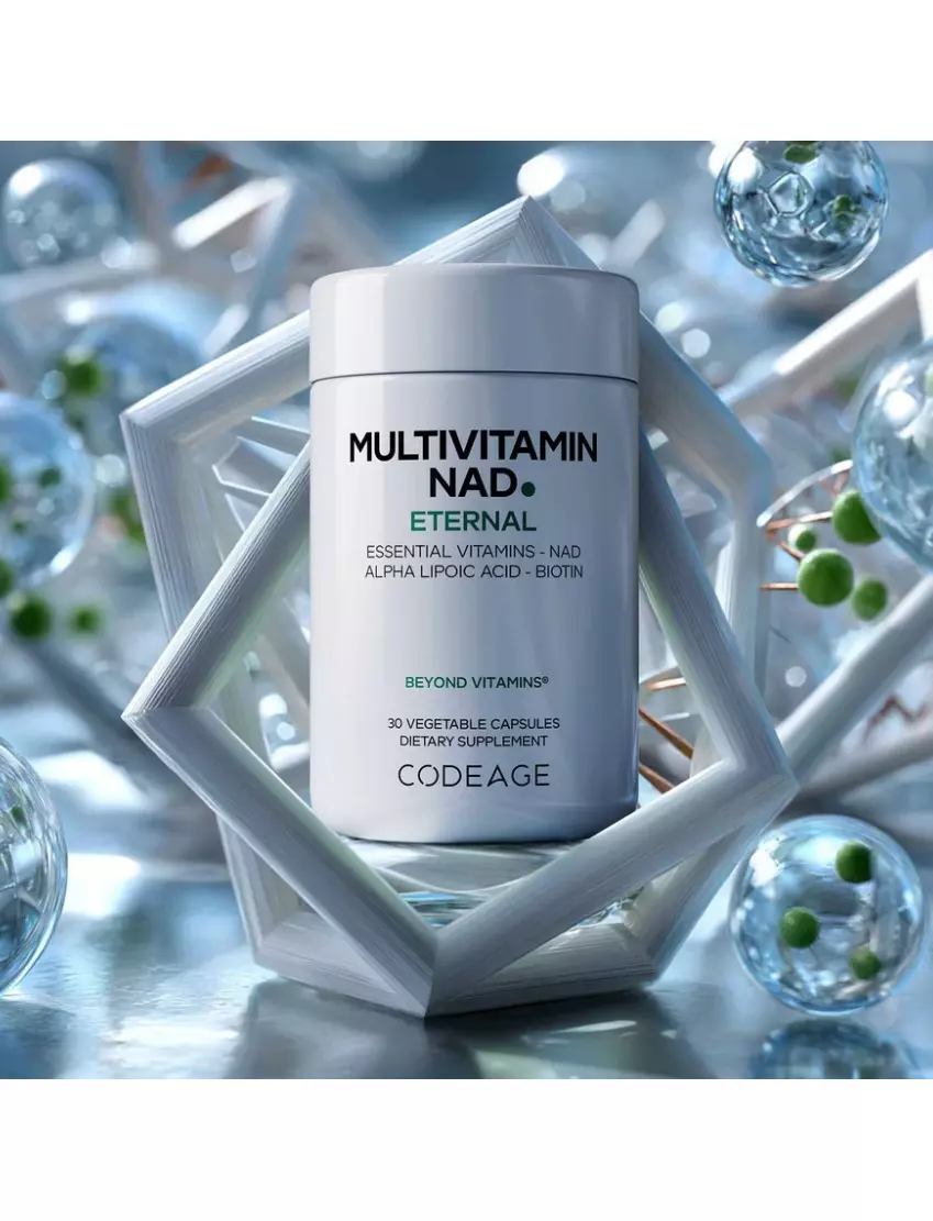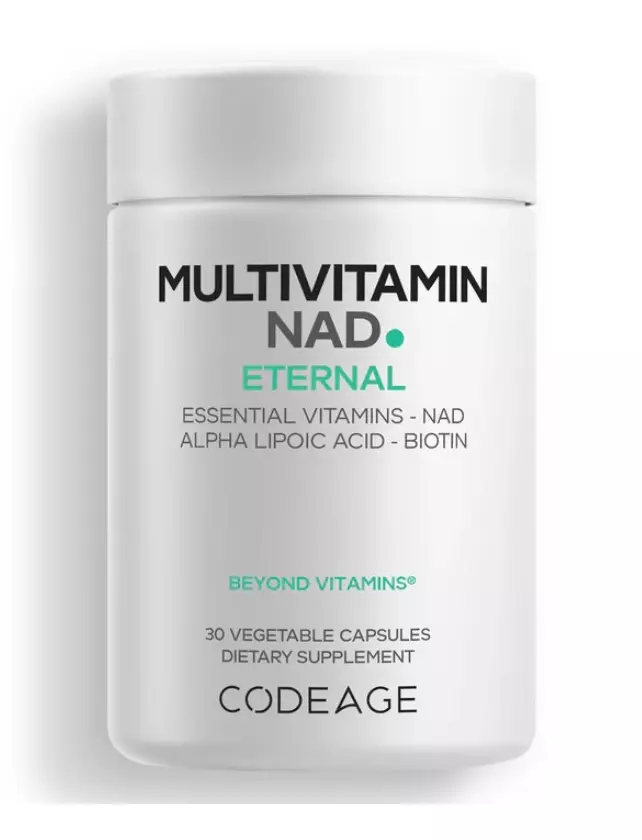 Codeage Multivitamin NAD пропонує вдосконалену формулу нікотинамідаденіндинуклеотиду (NAD+) з комплексним мультивітамінним профілем, включаючи метильований вітамін Б12 (метилкобаламін), метильований фолат, P5P (активний вітамін Б6), вітамін A (у вигляді бета-каротину), C, Д3, E та K2 — все в одному продукту.