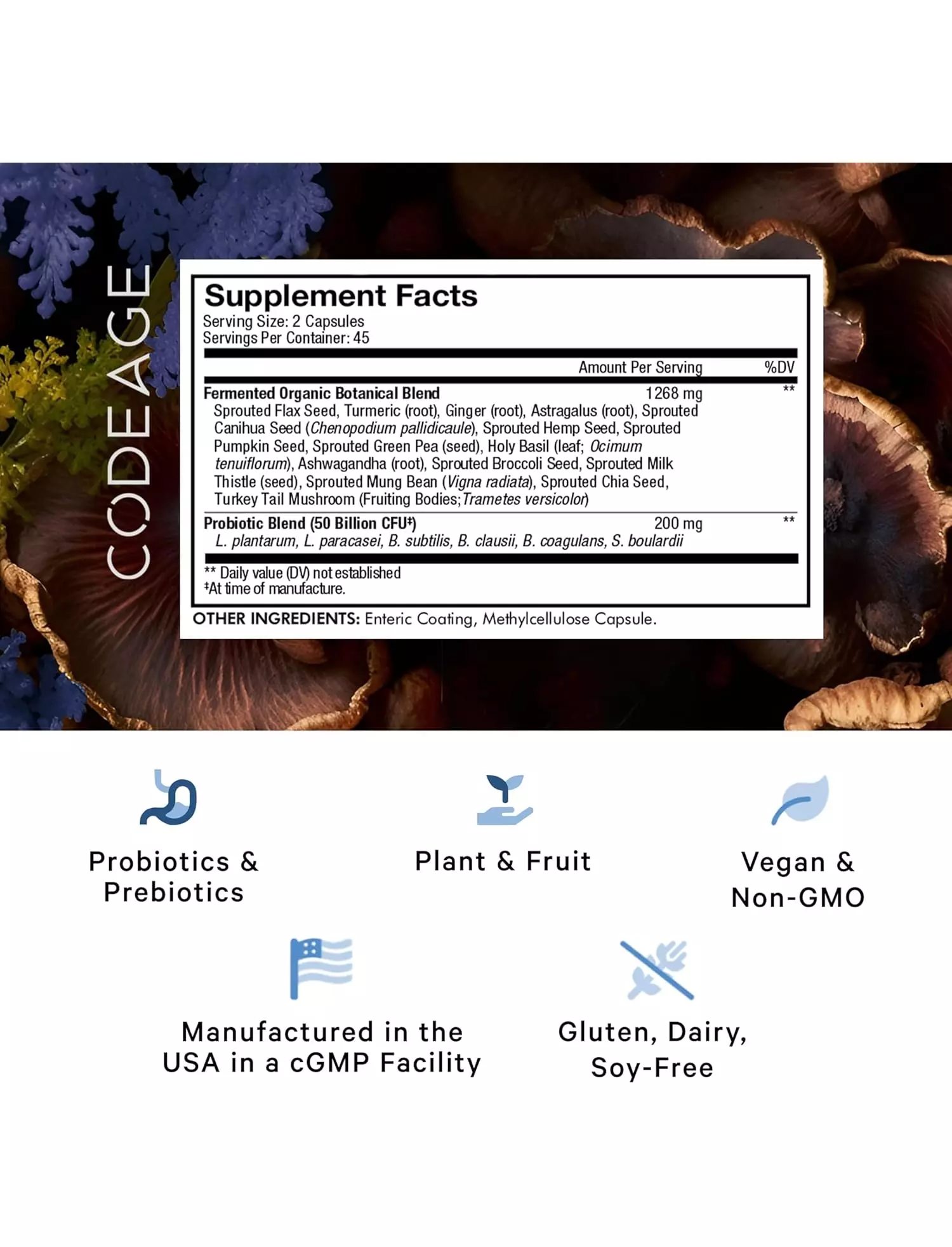 Пробіотична добавка Codeage є веганською і не містить ГМО. Ця формула також не містить глютену, молочних продуктів та сої. Капсули з пробіотиками Codeage виробляються у США на підприємстві, сертифікованому cGMP, і тестуються третьою стороною.
