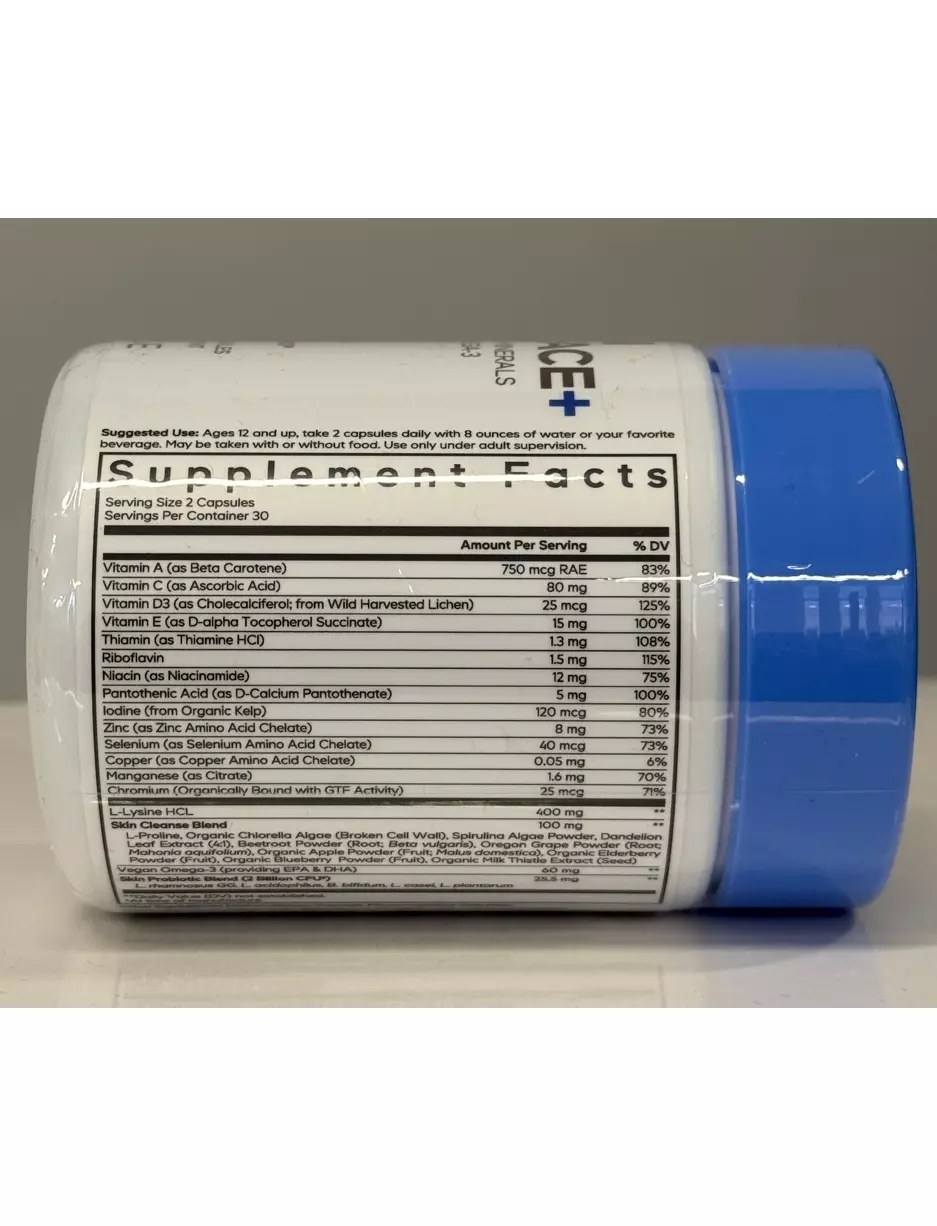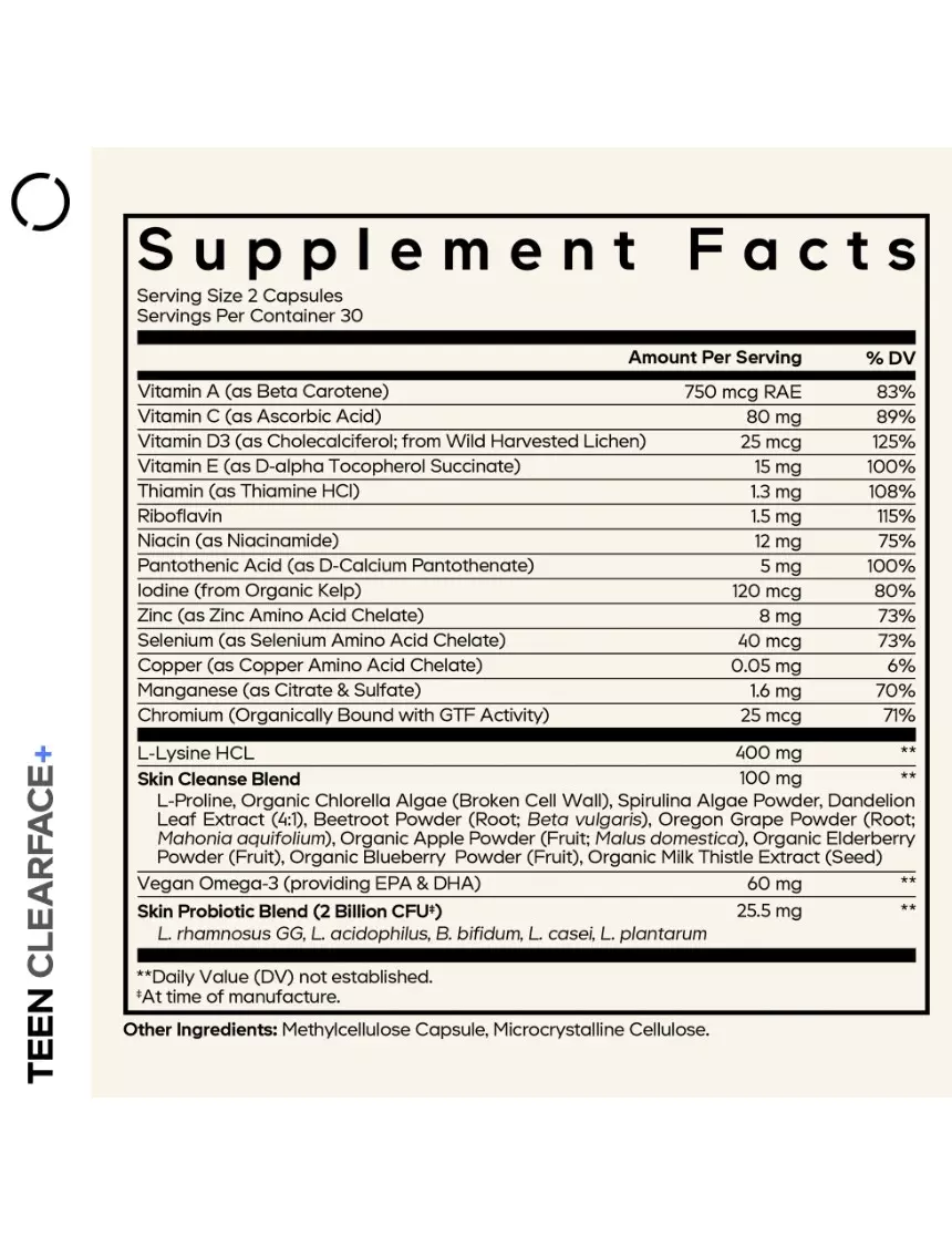 універсальна формула для підлітків 12-18 років, що містить веганський вітамін А у вигляді натурального бета-каротину, вітамін С, вітамін D3 з дикого лишайника та вітамін Е з рисових висівок. Ця добавка для обличчя та шкіри також містить 8 мг цинку, а також селен, мідь та хром GTF.Codeage Teen Clearface+, наповнений необхідними вітамінами A, C, D3 та E, а також необхідними мінералами, такими як цинк, селен, мідь, марганець і хром, пропонує набір інгредієнтів для підтримки сяючого та чистого кольору обличчя. Наша унікальна суміш також включає веганські омега-3, суміш пробіотиків для шкіри, пантотенова кислота, ніацин у вигляді ніацинаміду та йод для додаткової підтримки шкіри.