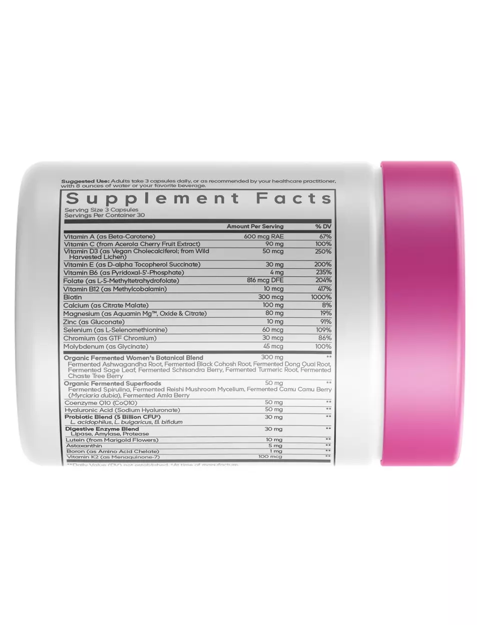 Цей мультивітамінний комплекс для жінок містить ферментовану рослинну суміш з клопогоном, донг кай, шавлією, ашвагандою, лимонником та ягодами вітексу, а також додаткові поживні речовини.