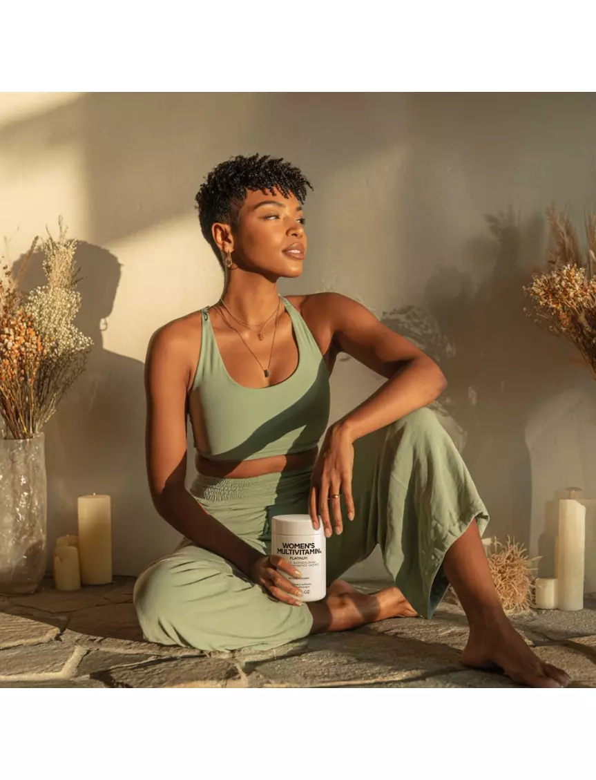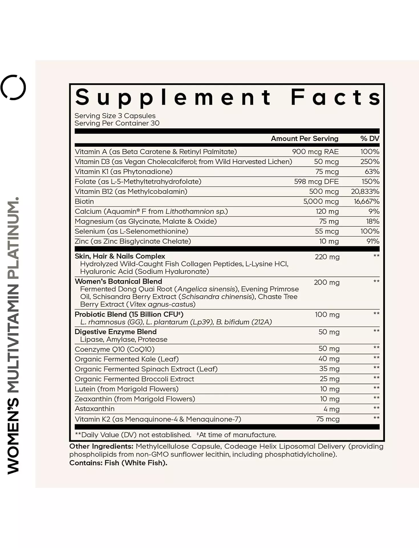 Жіночий мультивітамінний комплекс Codeage Platinum містить необхідні вітаміни A, Д3, K1, K2, Б 12 та фолат, а також CoQ10 та мінерали, включаючи кальцій, магній, селен та цинк Aquamin®.