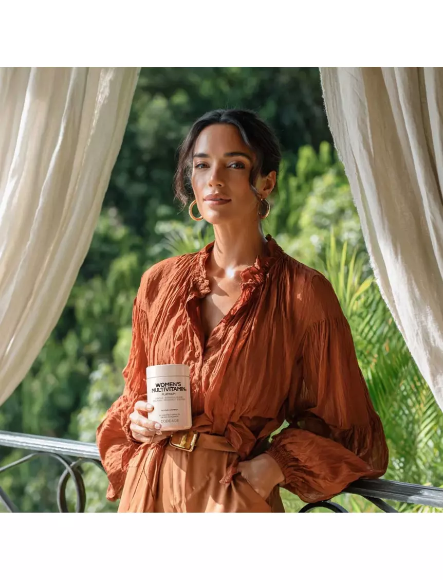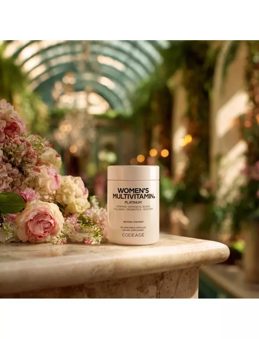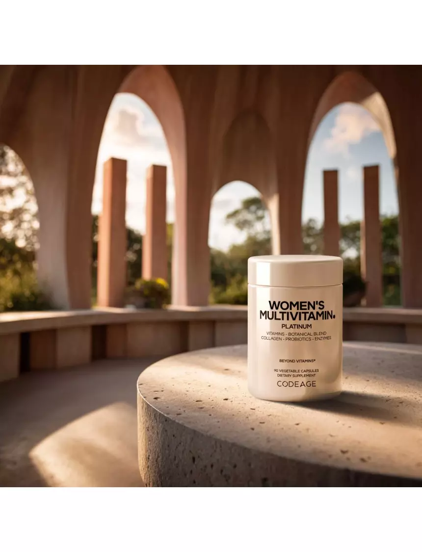 Жіночий мультивітамінний комплекс Codeage Platinum — це ультракомплексний мультивітамінний комплекс, який поєднує вітаміни A, Д3, K1, K2, Б12, CoQ10, необхідні мінерали, колагенові пептиди, а також вдосконалену рослинну суміш, пробіотики та травні ферменти у зручній капсульній формі.