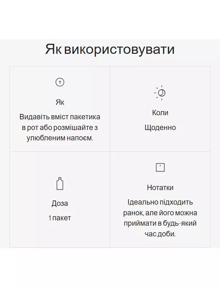 Видавіть вміст саше в рот або розмішайте з улюбленим напоєм. Ідеально підходить для прийому вранці, але можна приймати в будь-який час доби.