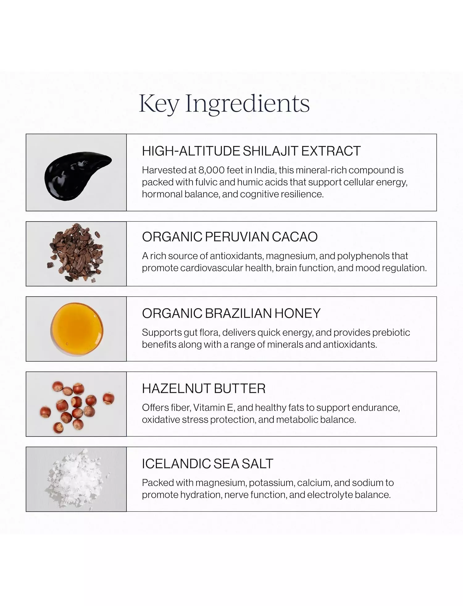 Кожна доза містить біодоступні фульвові мінерали та необхідні поживні речовини для підтримки когнітивних функцій, підтримки енергії та загального балансу. Ця багата суміш з фундуком і какао перетворить ваш щоденний ритуал на щось бажане та наповнене корисними речовинами.