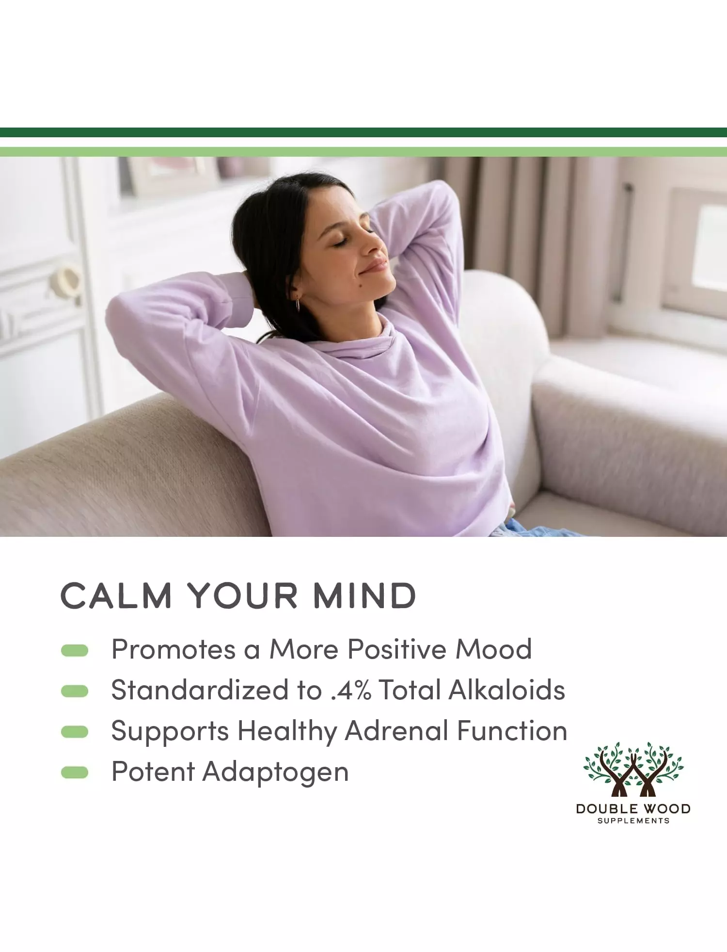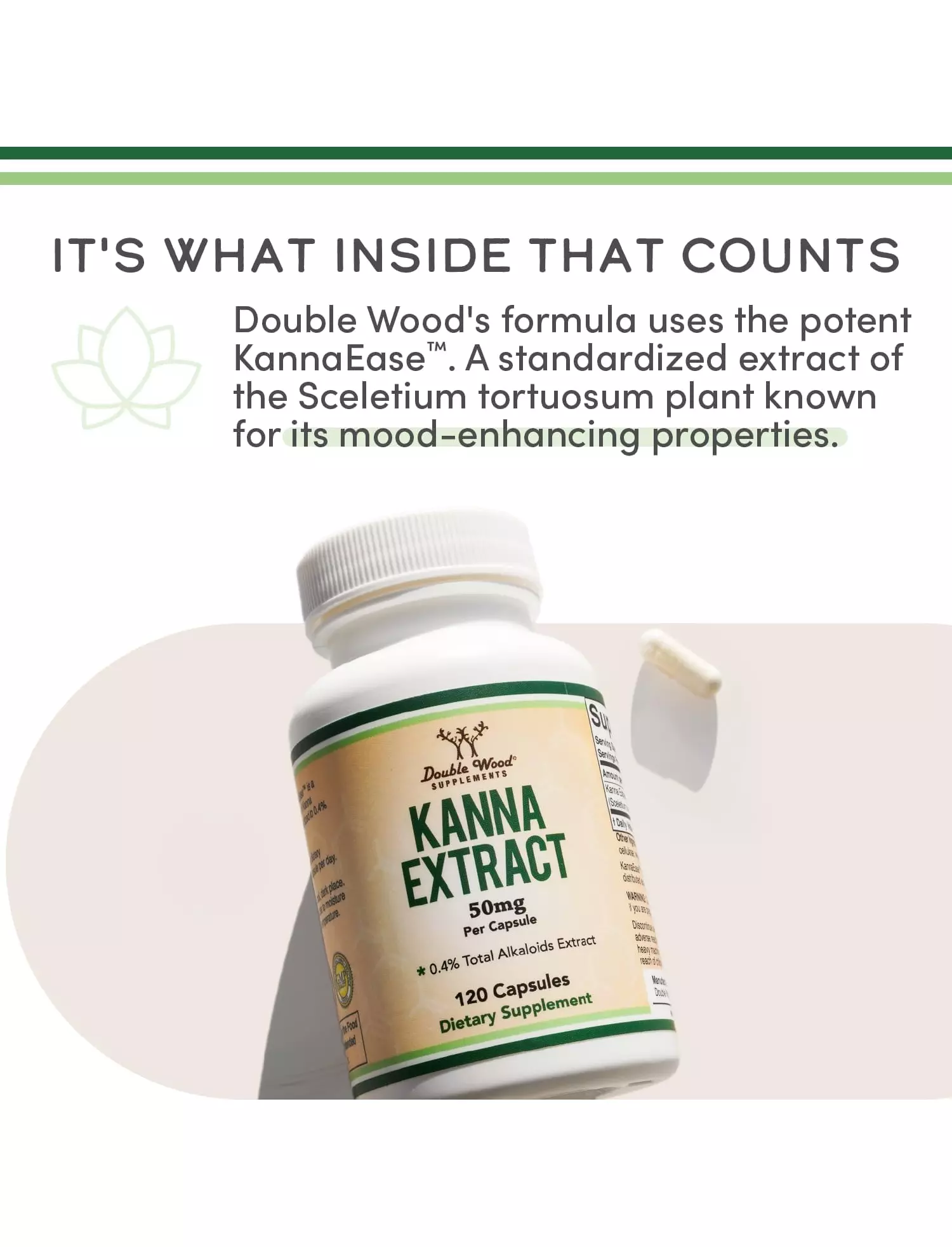 Екстракт Канни від Double Wood отримують з південноафриканської рослини, відомої своєю здатністю покращувати настрій і сон. Наукові дослідження показали, що алкалоїди, зокрема мезембрін, присутні в канні, можуть взаємодіяти з серотоніновими рецепторами мозку, що пояснює її антидепресивні властивості. Історично ця рослина використовувалася як нюхальний тютюн, що дарував відчуття бадьорості та ейфорії. Після цього наставало приємне розслаблення.