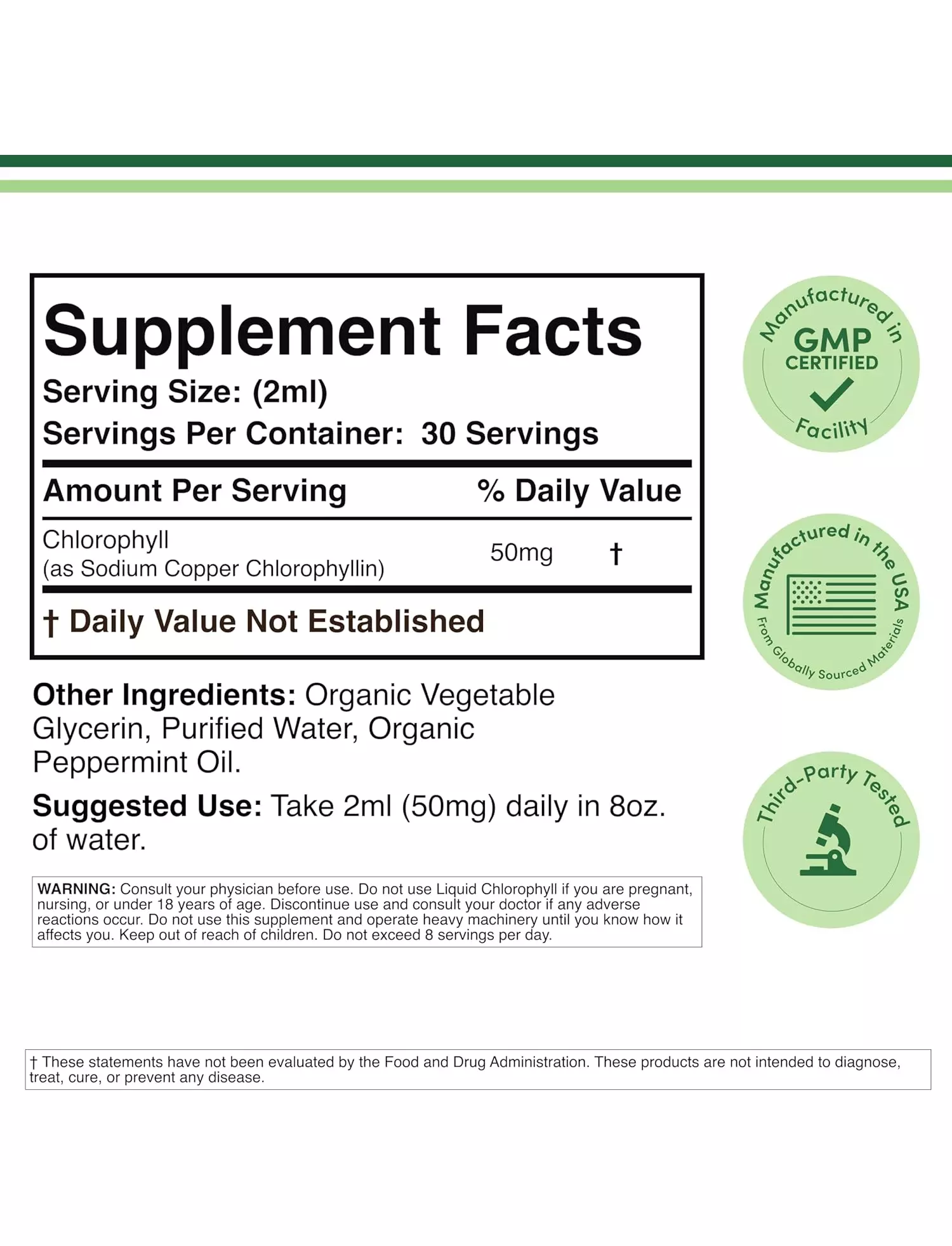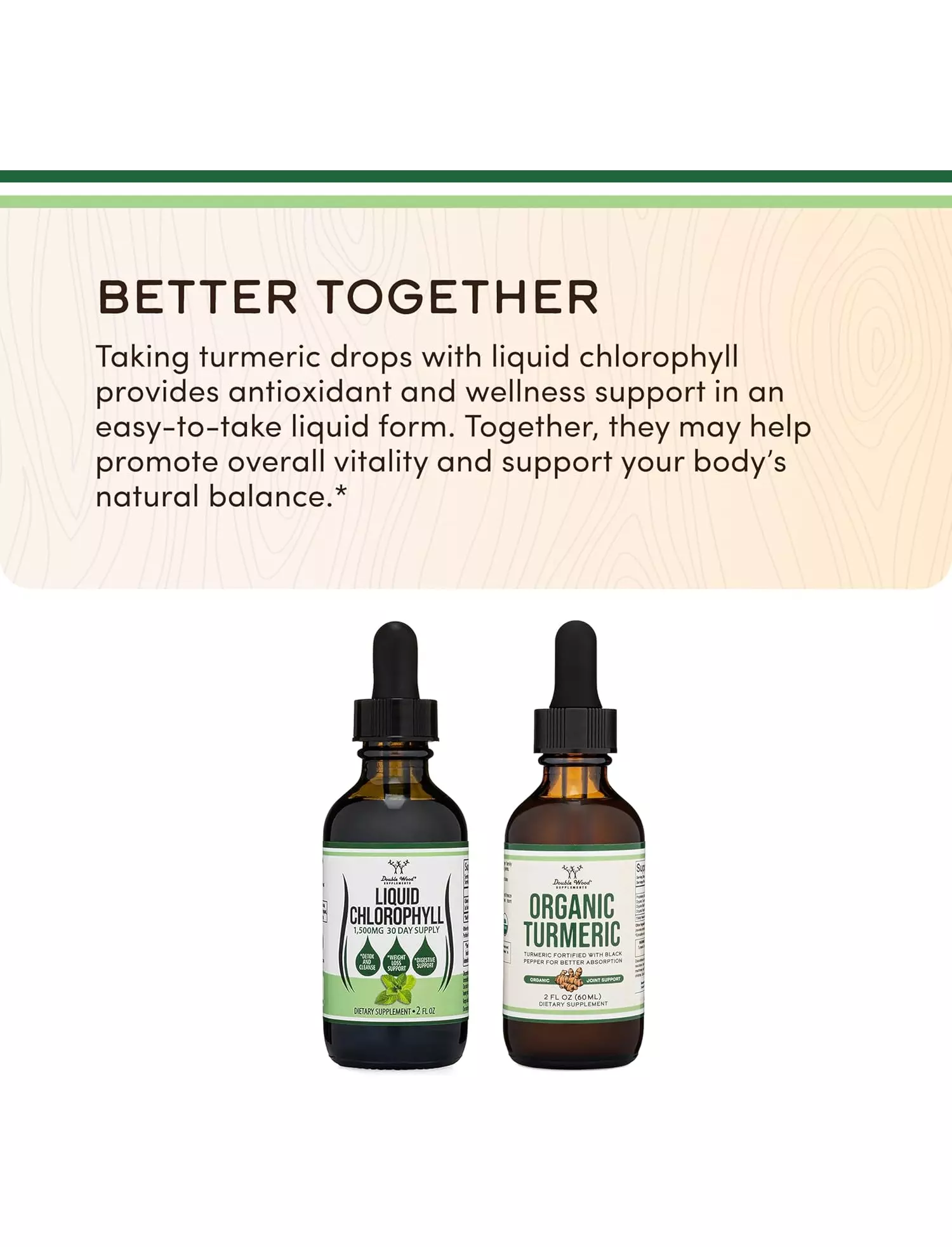 рідкий хлорофіл Double Wood виготовляється та тестується на наявність мікробів і важких металів у США з інгредієнтів з усього світу. Крім того, він безпечний для вегетаріанців, не містить ГМО та глютену.