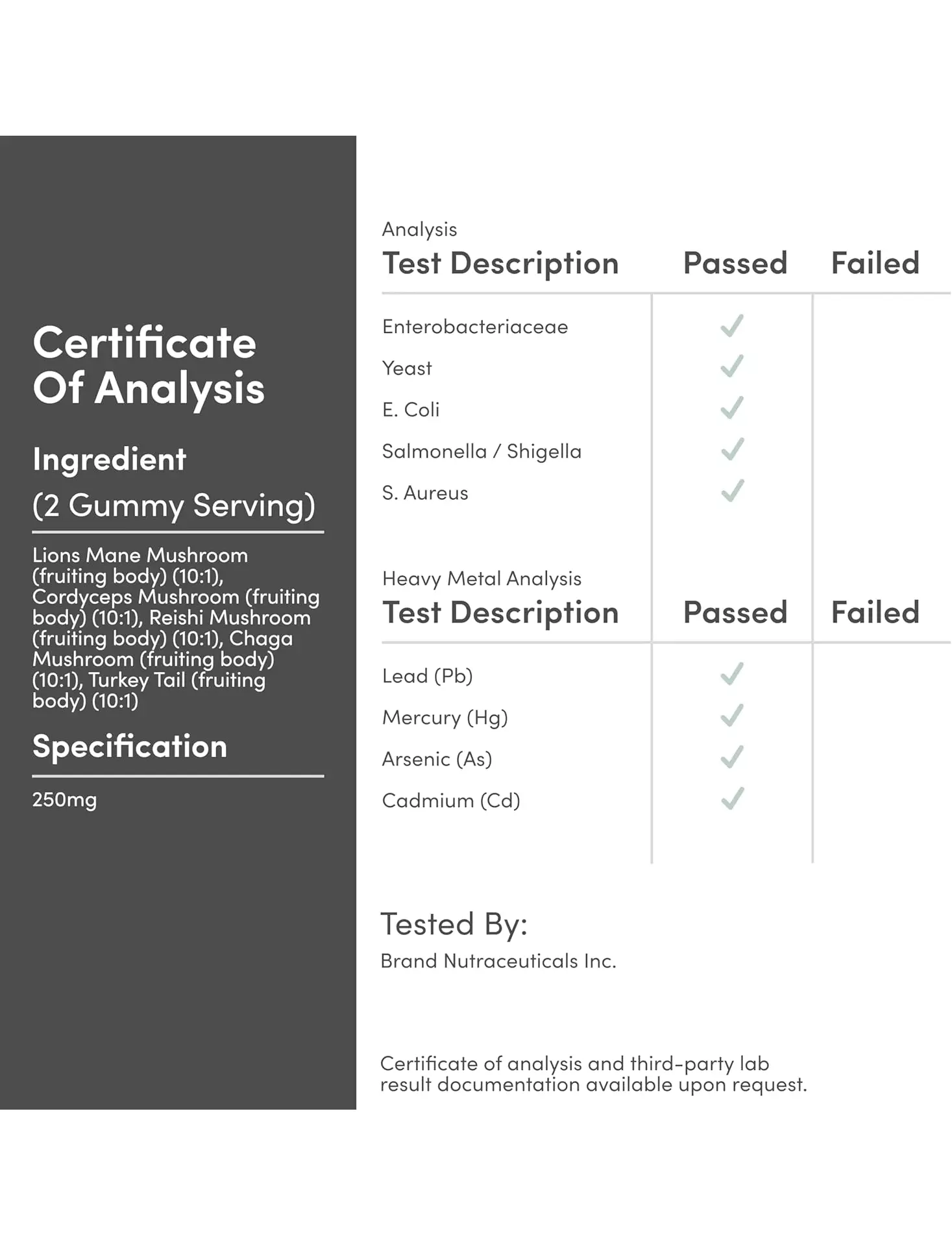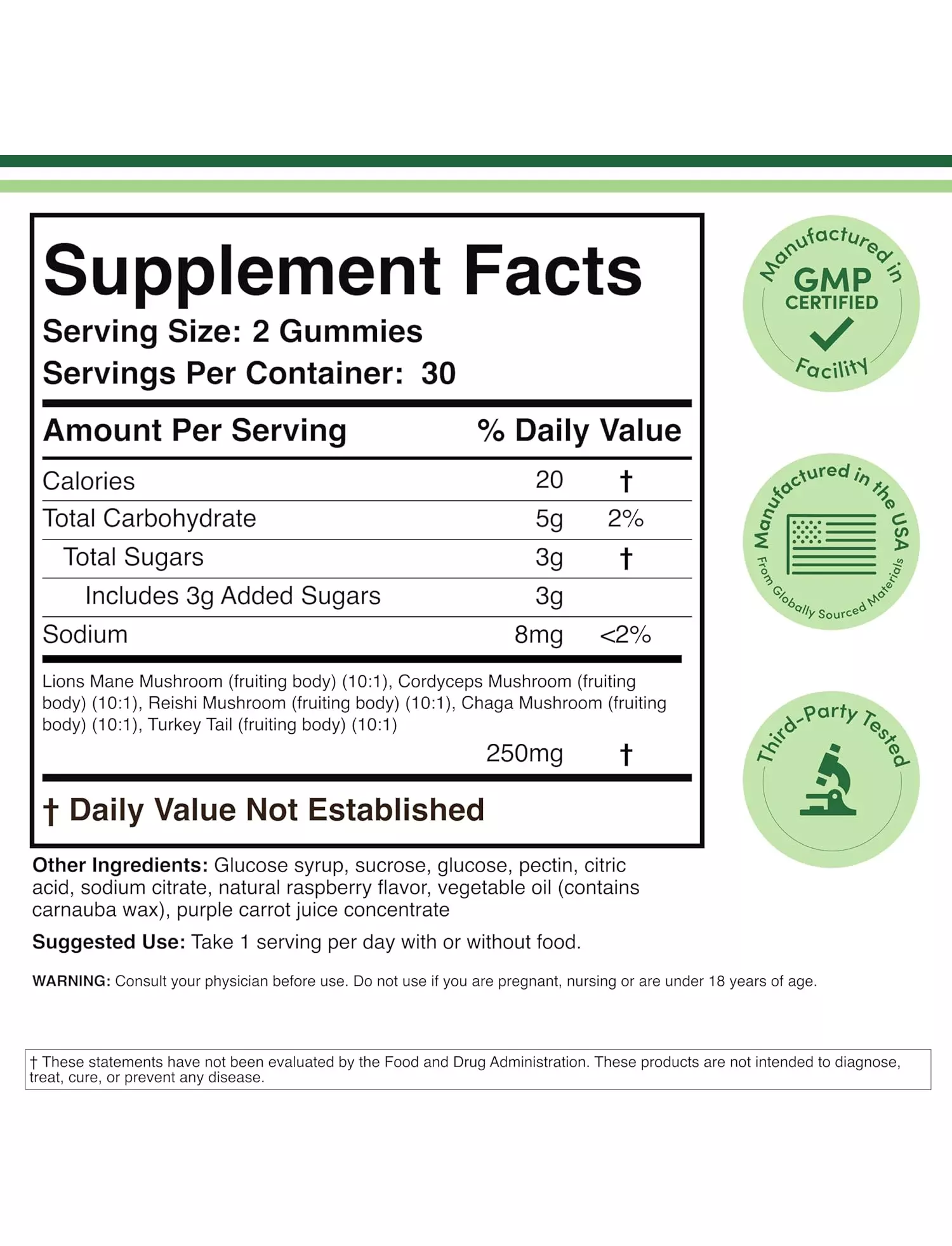 Кожна порція містить 250 мг концентрованих у співвідношенні 10:1 екстрактів таких грибів: їжовик гребінчастий, кордицепс, рейші, чага та траметес різнобарвний, що еквівалентно 2500 мг свіжих грибів.