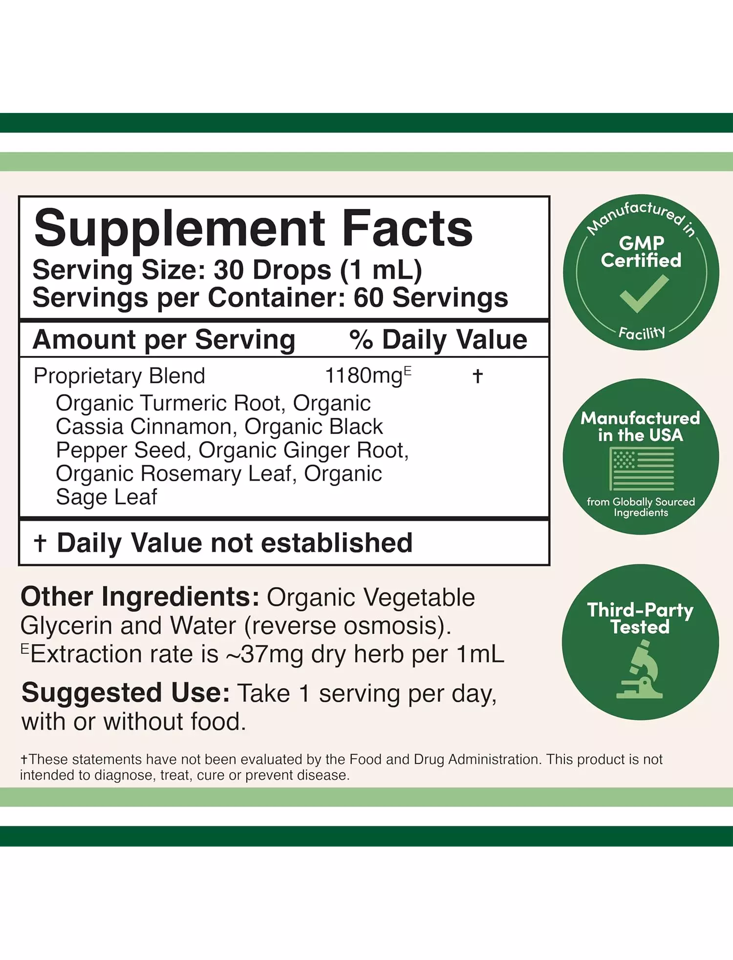 Крім куркуми та чорного перцю, органічний корінь імбиру забезпечує додаткову підтримку травлення й підсилює протизапальний профіль добавки. Органічне листя розмарину та шавлії містять потужні антиоксиданти та можуть мати когнітивний та імунний вплив. Такий підхід із використанням кількох трав створює синергетичний ефект, потенційно забезпечуючи комплексніший оздоровчий досвід, ніж домішка з куркумою, що складається з одного інгредієнта.
