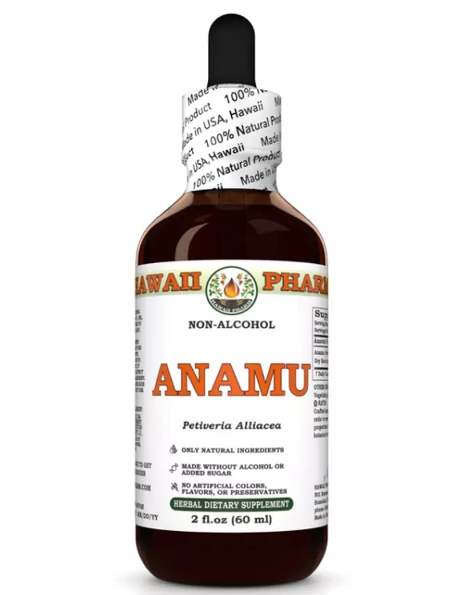 Petiveria Alliacea (Анаму) – це лікарська рослина, що широко використовується в народній медицині завдяки вираженим протизапальним, імуномодулюючим та протимікробним властивостям. Вона допомагає знімати біль, підвищує стійкість організму до вірусів, підтримує функції печінки та, за дослідженнями, може проявляти протигрибкові та протипухлинні ефекти: