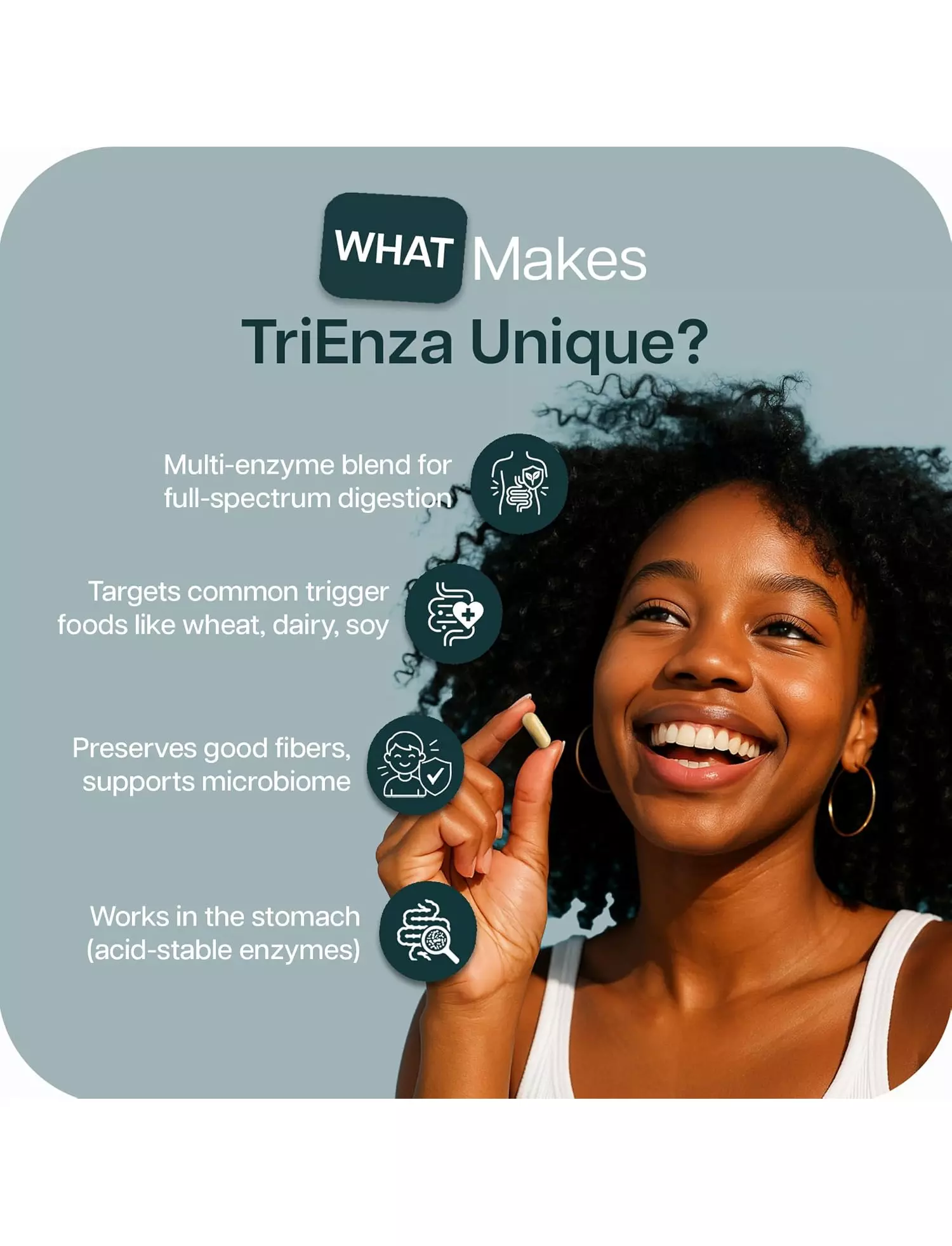 TriEnza® забезпечує травну підтримку широкого спектру продуктів. Унікальна суміш ферментів TriEnza розщеплює продукти, допомагаючи запобігти випадковому дискомфорту травлення через харчову непереносимість.