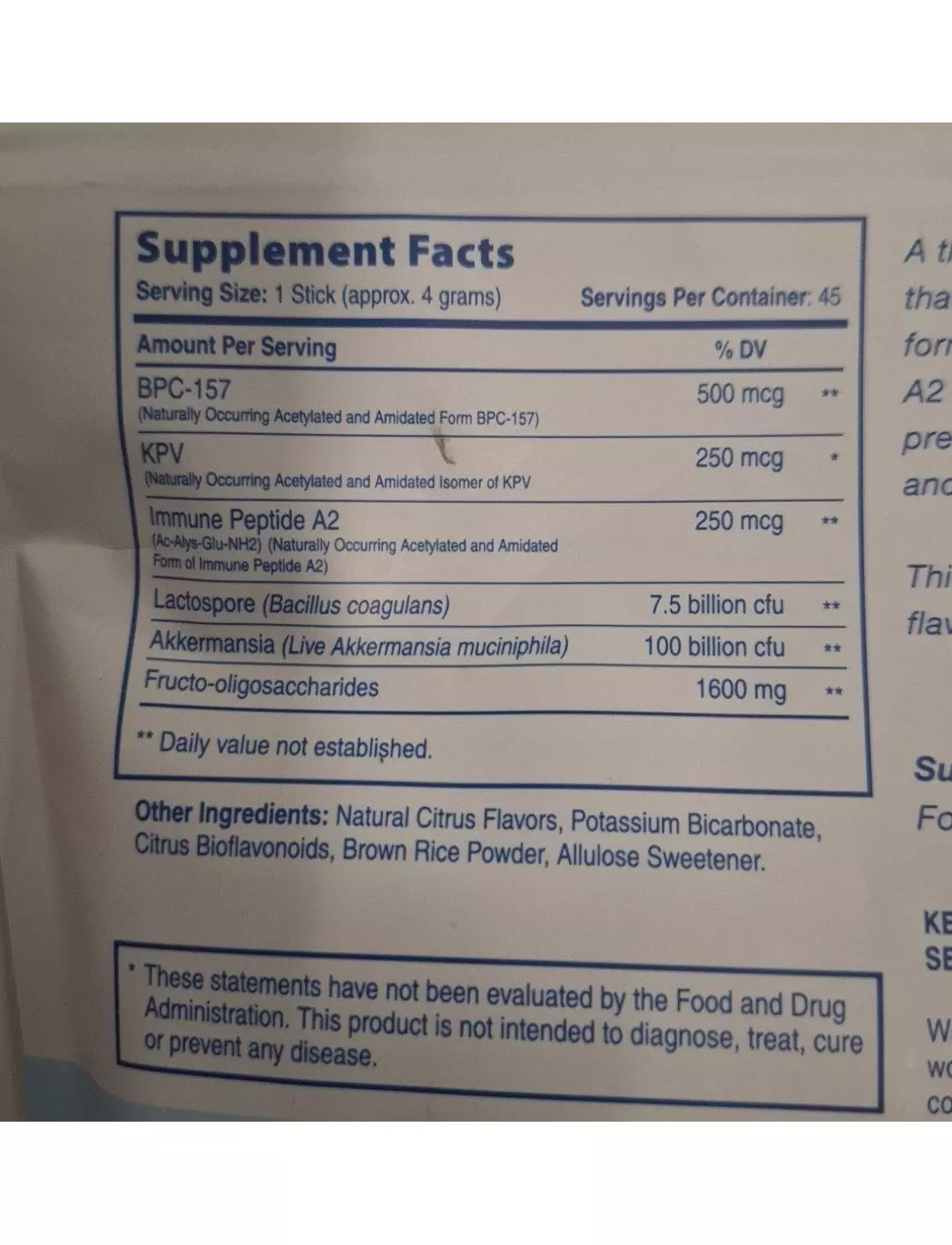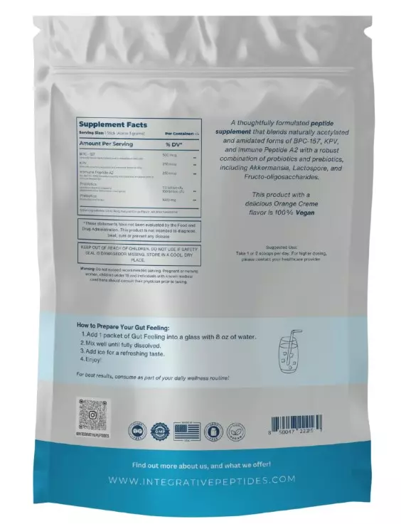 Gut Feeling — наша іноваційна суміш для напоїв для підтримки кишківника — це ретельно продумана пептидна добавка, яка поєднує в собі натуральні ацетильовані та амідовані форми BPC-157, KPV та імунного пептиду А2 з надійною комбінацією пробіотиків та пребіотиків, включаючи акермансію, лактоспору та фруктоолігосахариди.
