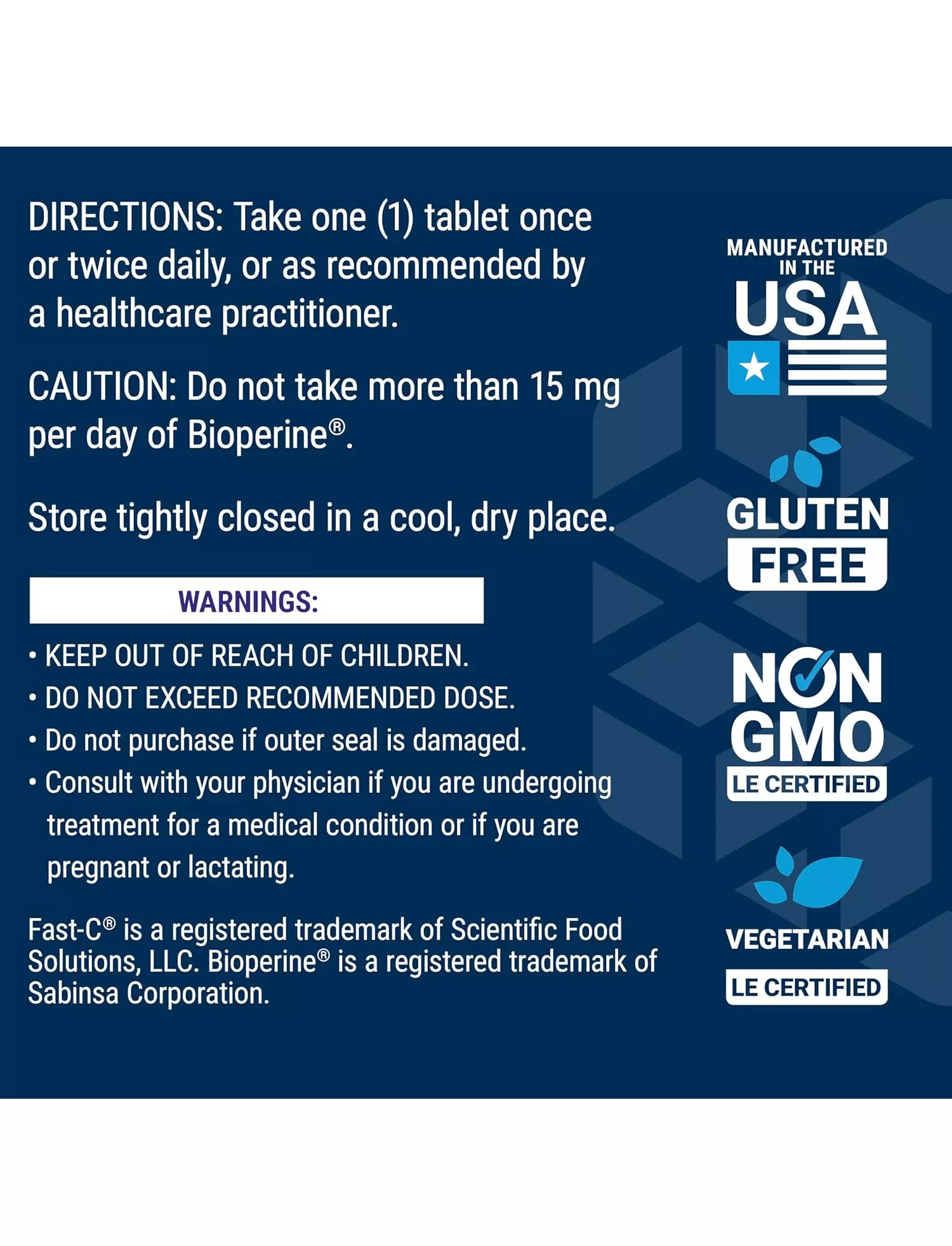 Fast-C® та Bio-Quercetin® – це інноваційна добавка вітаміну C, посилена екстрактом чорного перцю Bioperine® для підвищення біодоступності, ультрабіодоступною формою кверцетину та сучасним мінеральним комплексом кальцію і магнію для нейтралізації кислотності. Fast-C® забезпечує максимальне засвоєння та користь для здоров’я від додавання вітаміну C.