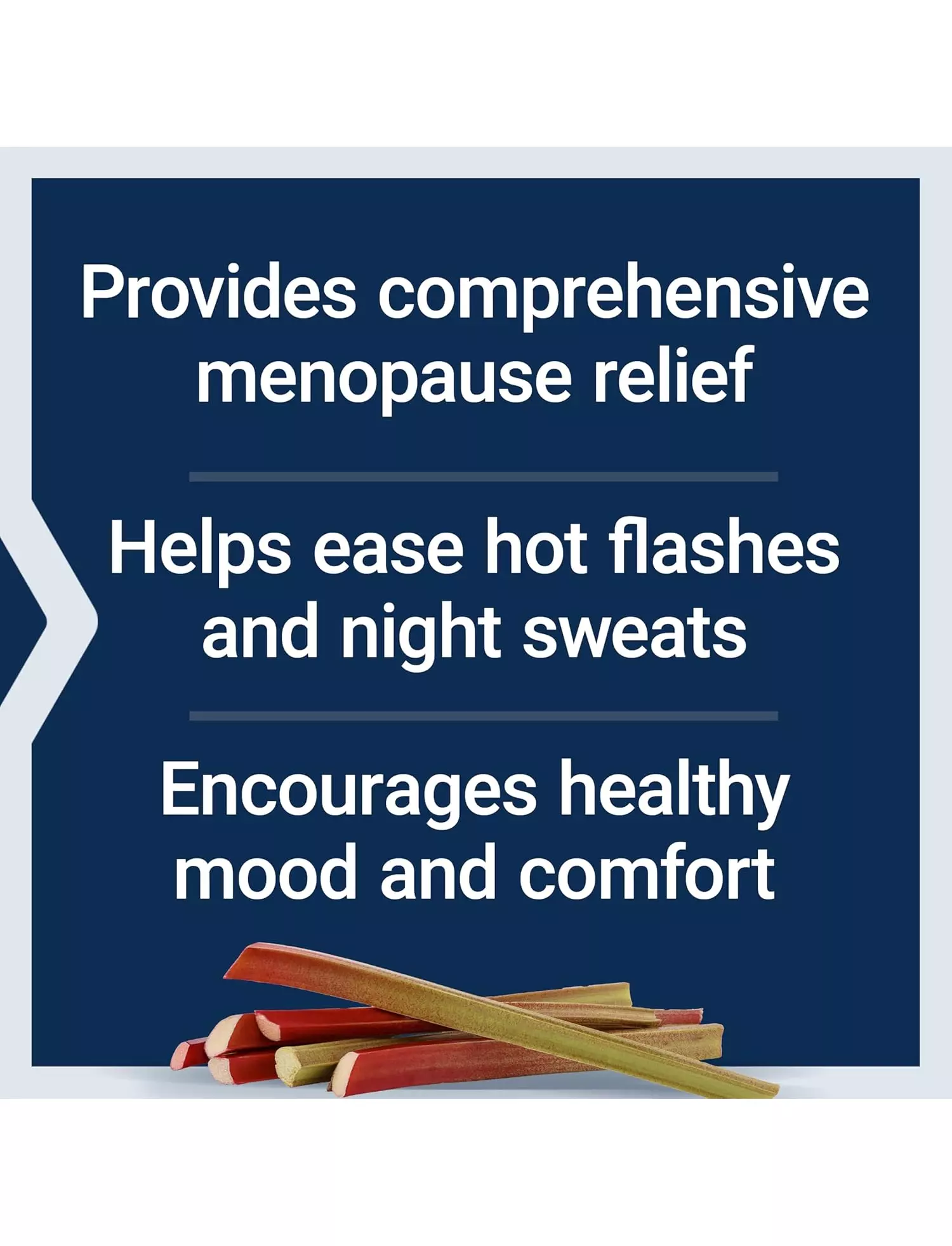 Menopause Relief містить клінічно досліджений екстракт кореня сибірського ревеню (R. rhaponticum), який допомагає зменшити 11 поширених симптомів менопаузи: припливи, нічну пітливість, дратівливість, перепади настрою, порушення сну, виснаження, дискомфорт у суглобах і м’язах, сухість піхви, підтримку сечовидільної системи та сексуальної функції.