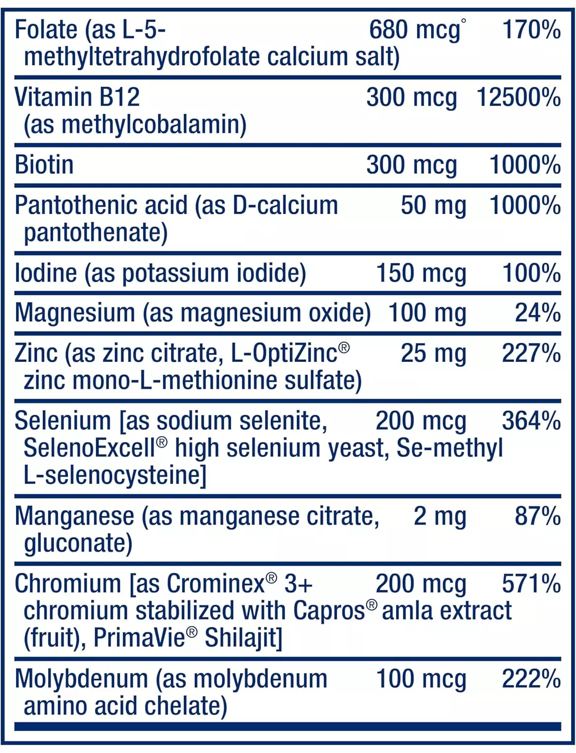 більшість комерційних мультивітамінів містять лише альфа-токоферольну форму вітаміну Е, але існує чотири токофероли. Одна порція на день містить усі чотири. Щодо біомаркерів оксидативного стресу, дані свідчать про те, що поєднання альфа- та гамма-токоферолів краще, ніж прийом будь-якого з цих поживних речовин окремо. Наша формула містить понад 80 мг змішаних альфа-, бета-, дельта- та гамма-токоферолів.Високоефективні мінерали, антиоксиданти та екстракти: