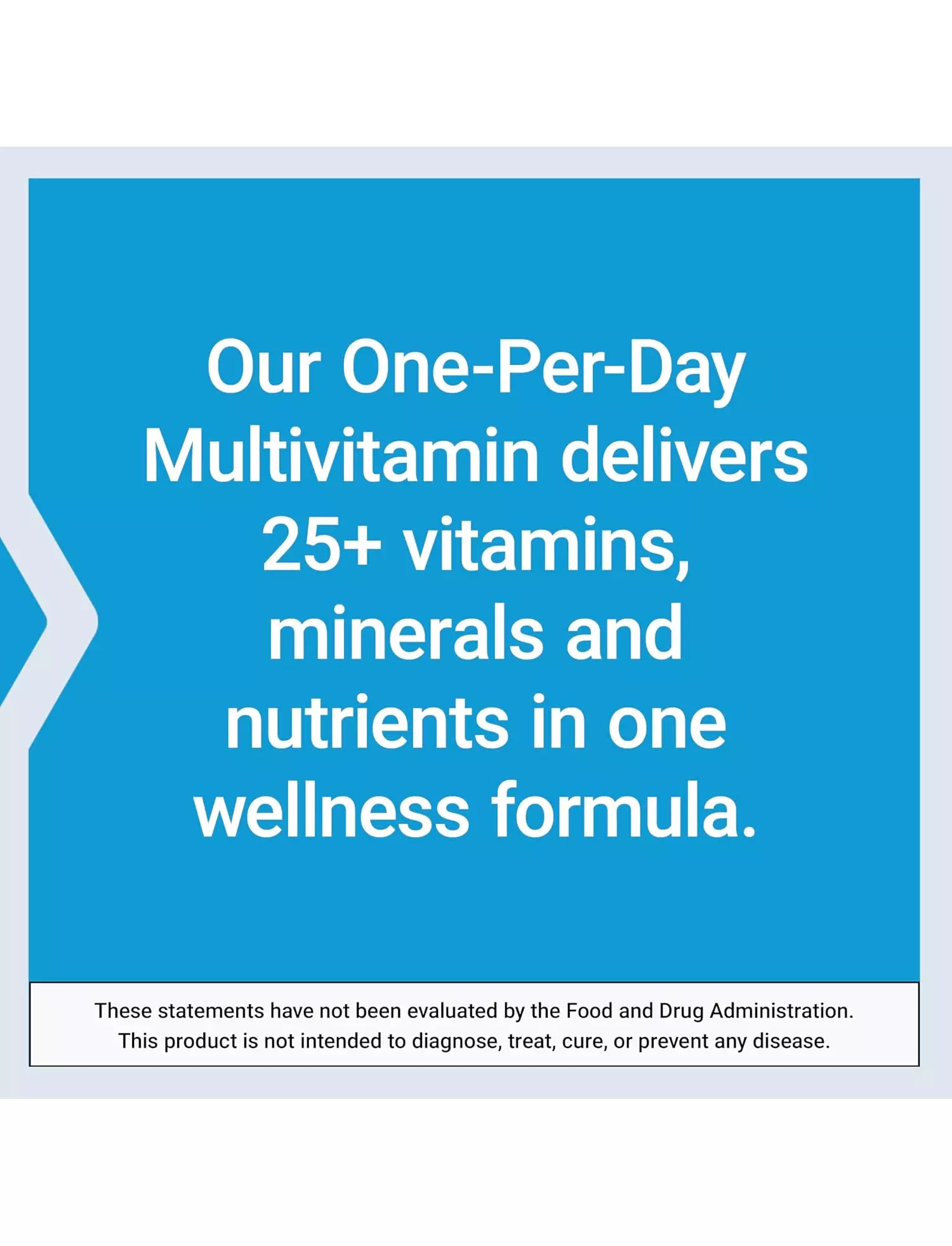 Комплекс One-Per-Day Multivitamin забезпечує ті ж переваги необхідних вітамінів, мінералів та інших поживних речовин, що й наша найкраща у своєму класі формула «Two-Per-Day», але в зручній формі для разового прийому на день.