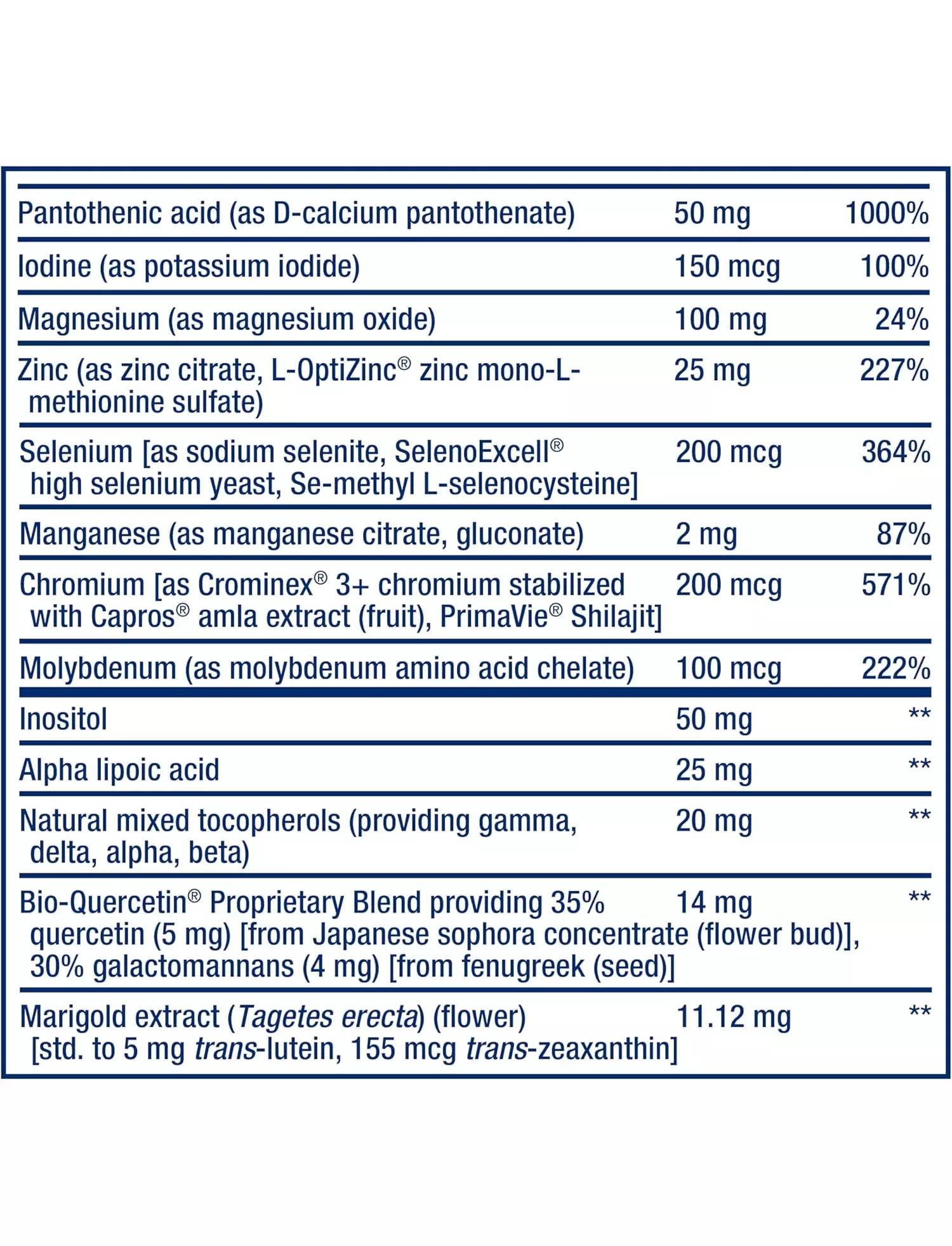 - Цинк (у вигляді цитрату цинку, L-OptiZinc® Zinc mono-L-Methionine Sulfate) 25 мг / 227%