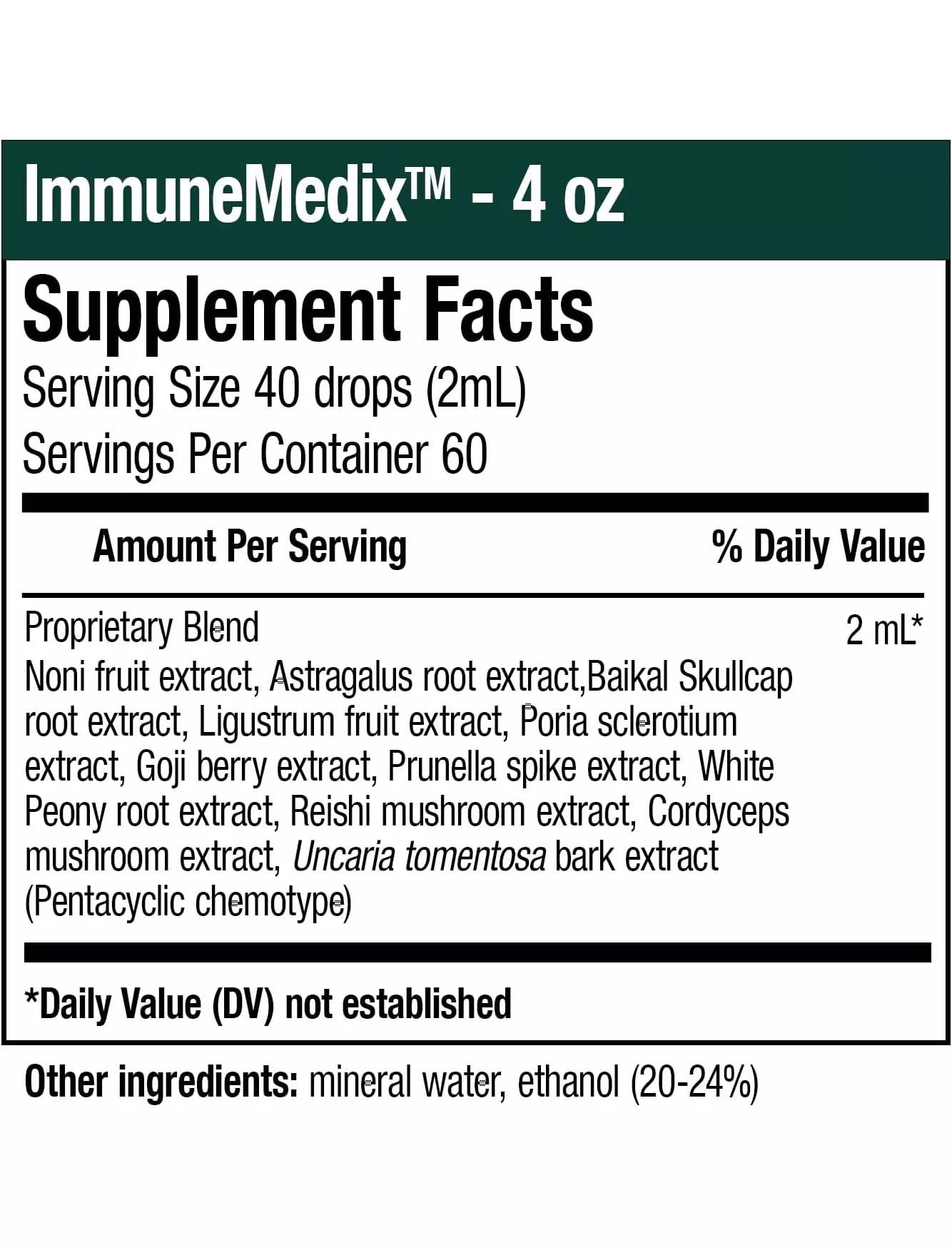 До складу ImmuneMedix входять плоди ноні (Morinda citrifolia), корінь астрагалу (Astragalus mongholicus), корінь шоломника байкальського (Scutellaria baicalensis), порія склеротична, ягоди годжі (Lycium barbarum), екстракт чорноголовки, корінь білої півонії (Paeonia Lactiflora), гриб Рейші (Ganoderma Lucidum), гриб Кордицепс (Cordyceps sinensis) і котячий кіготь.