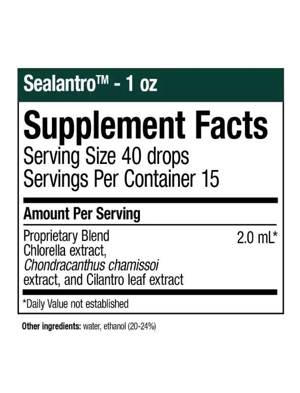 NutraMedix Sealantro™ — це запатентована суміш гідроетанольних екстрактів з хлорели (Chlorella spp.), листя кінзи (Coriandrum sativum) та тихоокеанських червоних морських водоростей холодної води (Chondracanthus chamissoi).