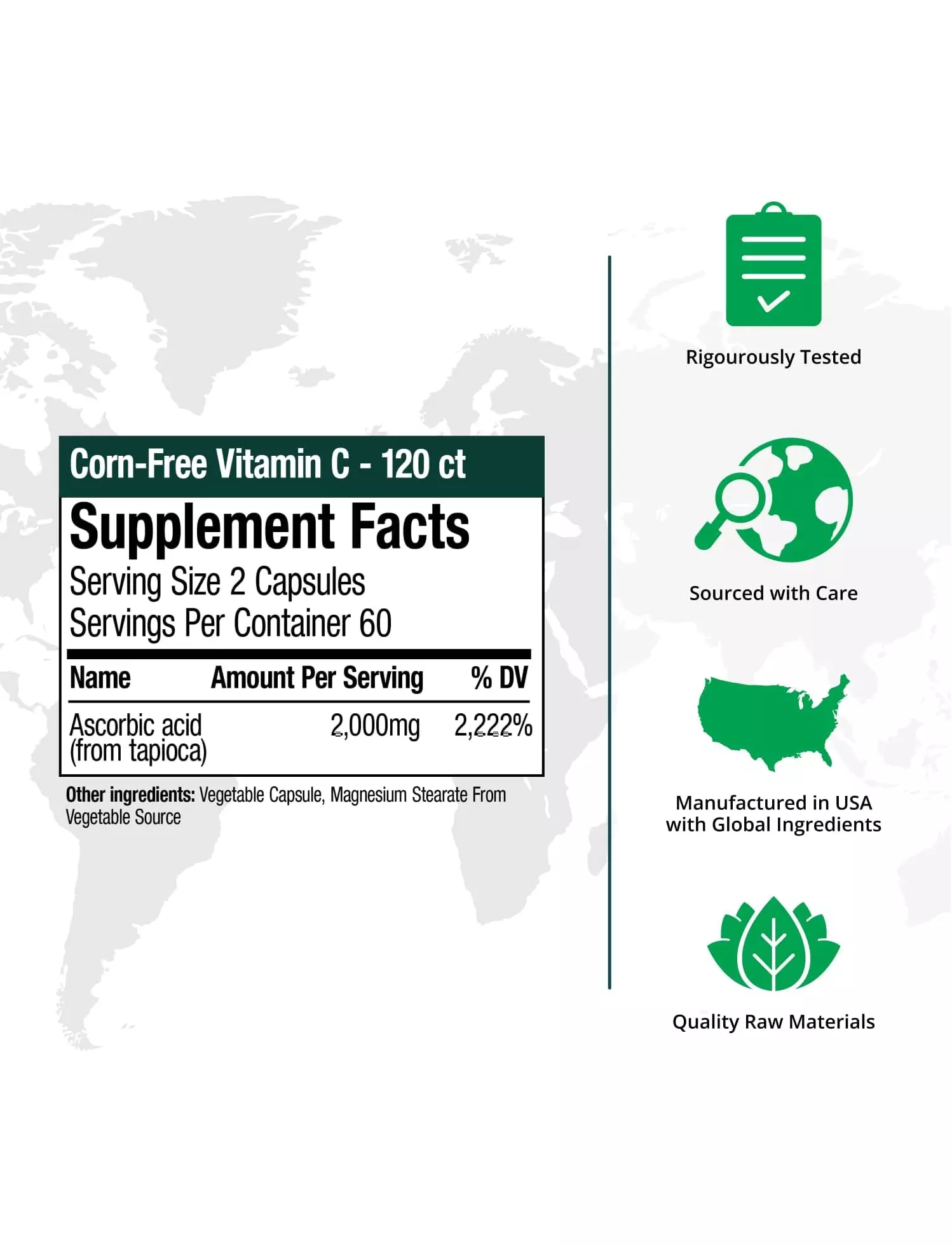 Наші високоякісні капсули з вітаміном С, що легко ковтаються, отримані з кореня маніокі (тапіоки), розроблені спеціально для того, щоб допомогти вам задовольнити щоденну потребу у вітаміні С, при цьому повністю виключаючи з раціону кукурудзу і зернові!