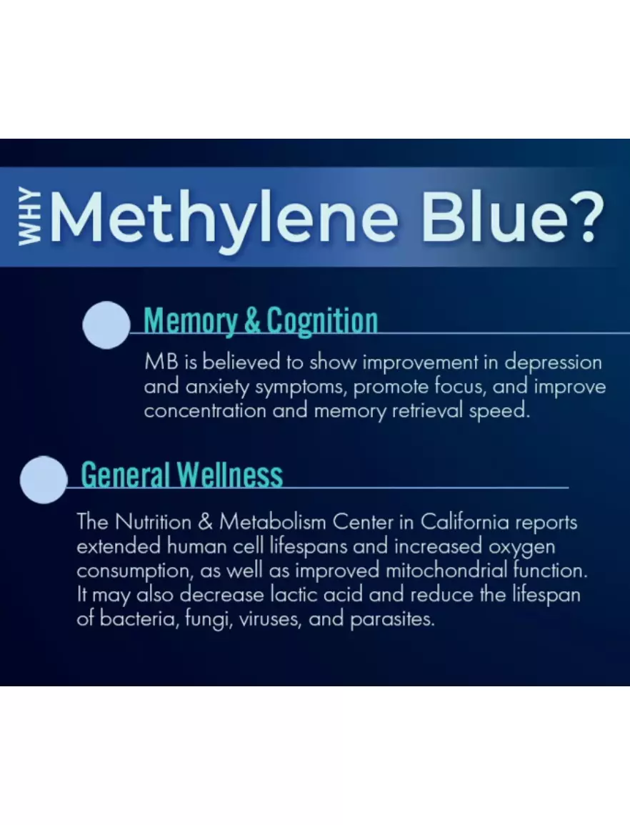 вважається, що метиленовий синій допомагає покращити вироблення енергії в мітохондріях клітин, покращуючи приплив кисню та крові до мозку.