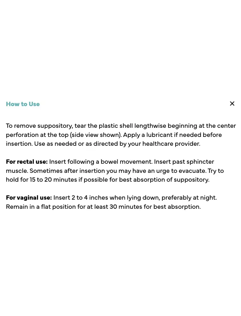 Вводьте від 5 до 10 см у положенні лежачи переважно на ніч. Залишайтеся в горизонтальному положенні не менше 30 хвилин для кращого поглинання.