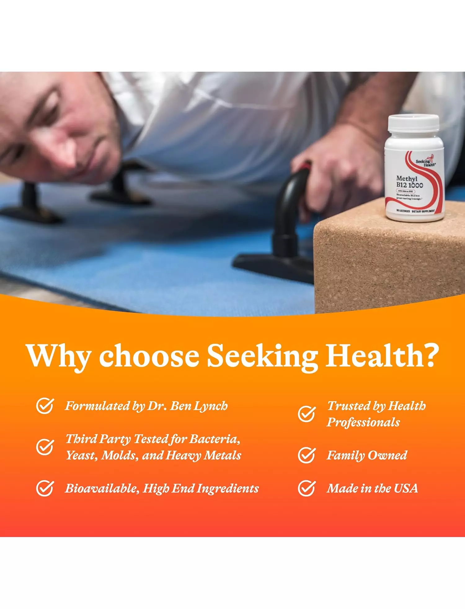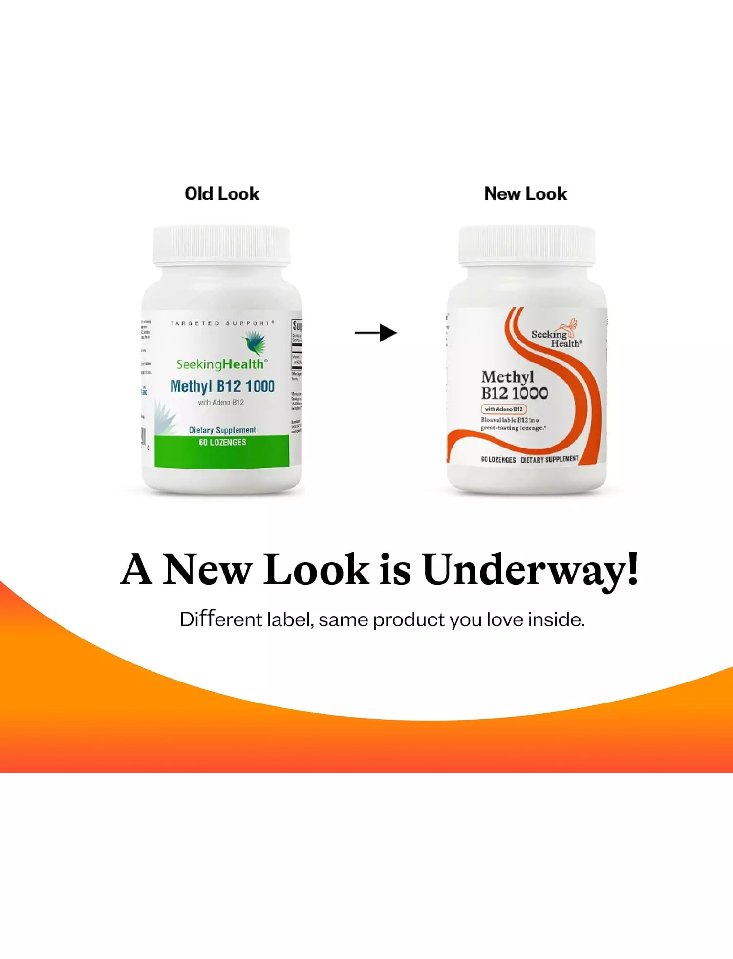 Methyl B12 1000 від Seeking Health містить дві активні «коензимні» форми вітаміну Б12, метилкобаламін та аденозилкобаламін, у нижчій дозі 1000 мкг (1 мг) на таблетку.