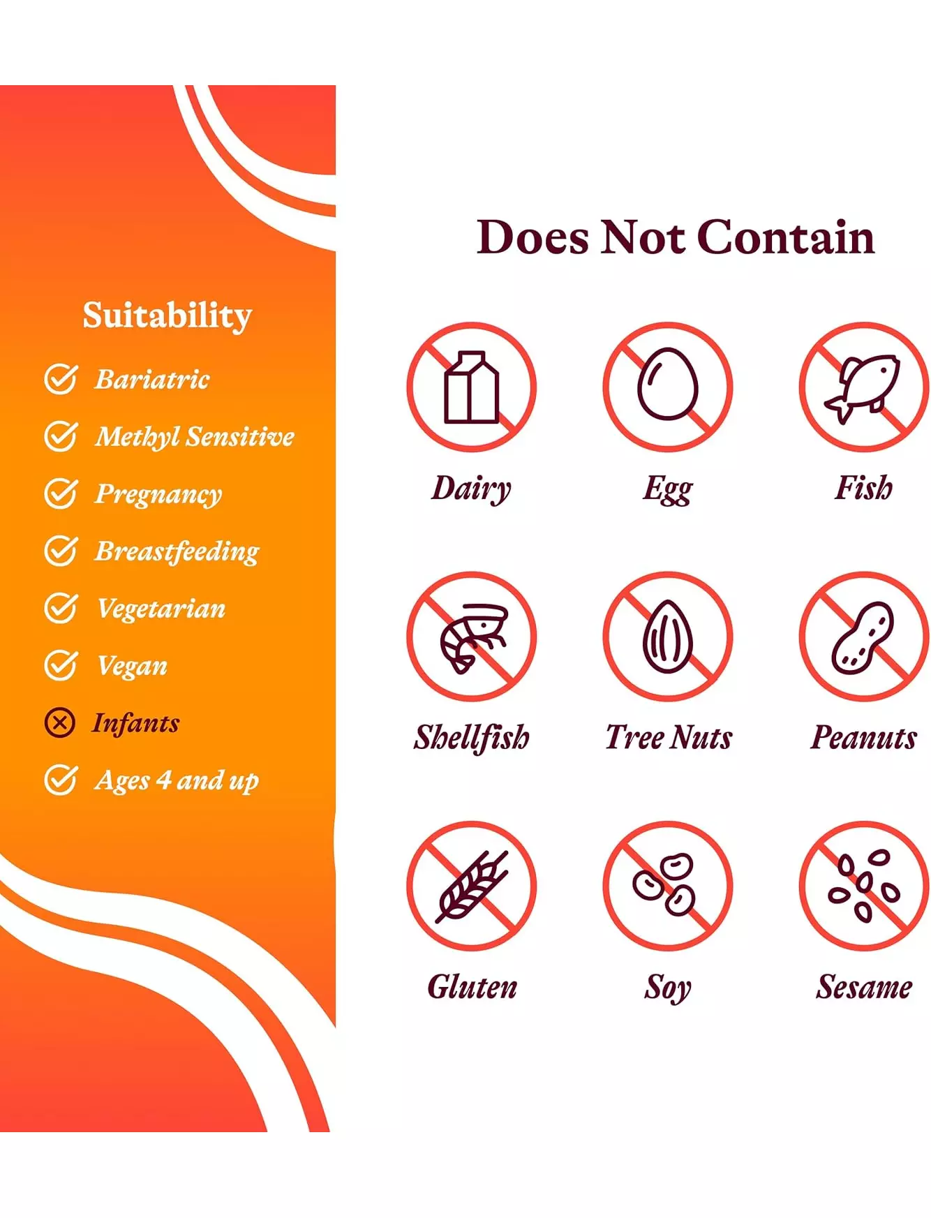 яєць, риби, глютену, ГМО, молока, арахісу, молюсків, сої, лісових горіхів, пшениці, штучних барвників, штучних ароматизаторів і штучних консервантів.Постійна якість: