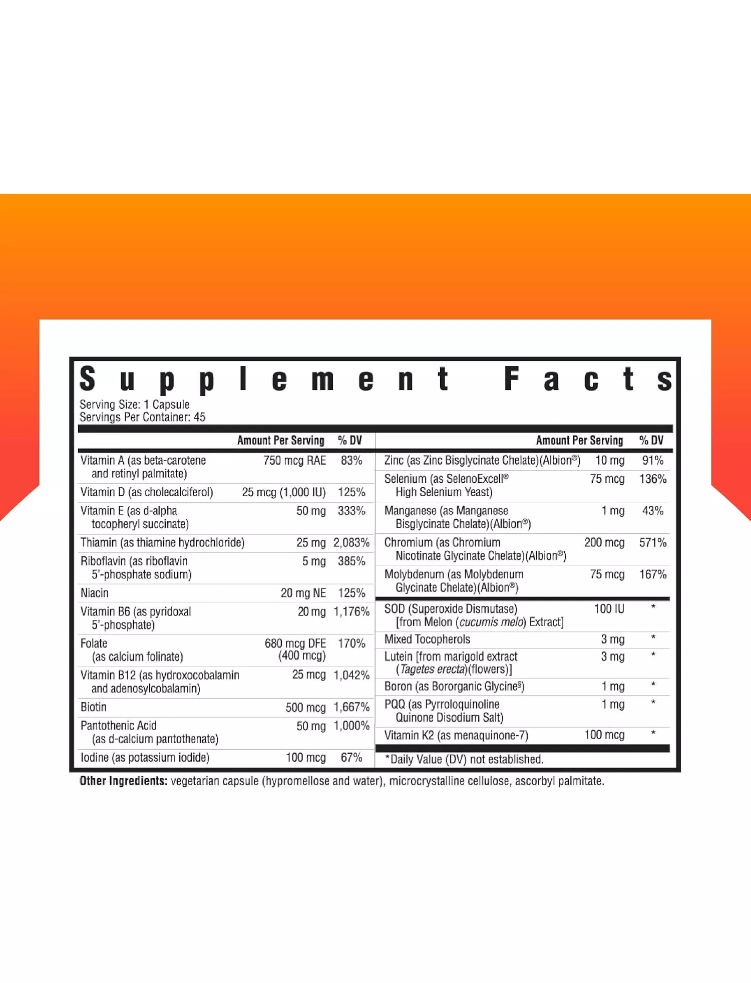Ця формула укладена в легкозасвоювану вегетаріанську капсулу для оптимального засвоєння. Він не містить глютена і не містить маркерів ГМО, штучних ароматизаторів, штучних підсолоджувачів, штучних барвників та консервантів.