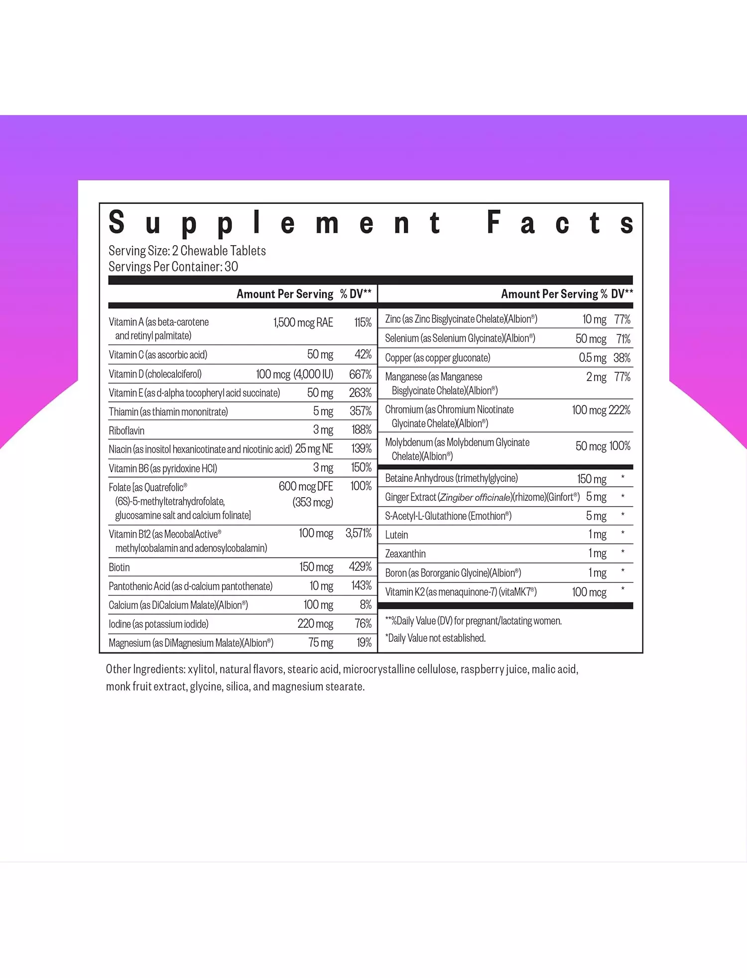Забезпечує основні поживні речовини, необхідні для підтримки здорової фертильності, вагітності та грудного вигодовування, у смачній, легко розжовуваній таблетці з біодоступними фолатами, вітаміном Б12, хелатними мінералами, а також антиоксидантною підтримкою – ідеально підходить для жінок, яким важко ковтати капсули або які віддають перевагу зручному варіанту для використання в дорозі.