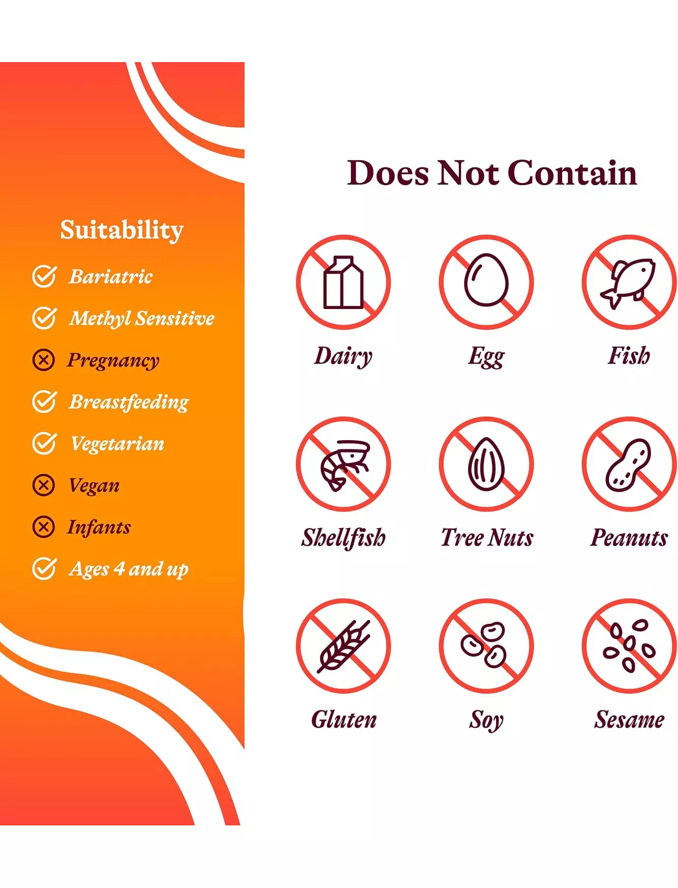 Підходить для людей після баріатричної операції, чутливих до метилювання, при грудному вигодовуванні, вегетаріанців, дітей від 4 років і старше.