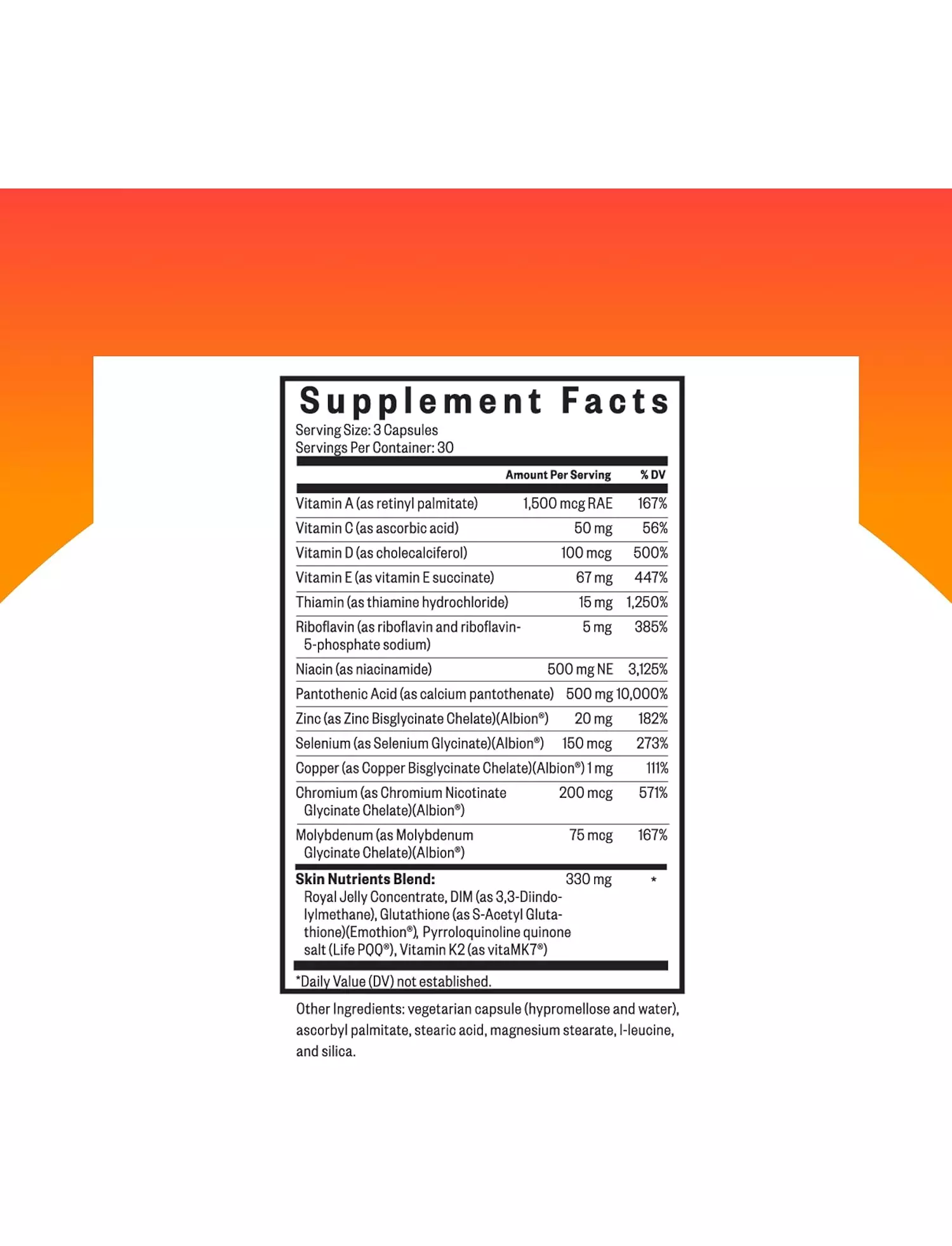 DIM підтримує здоровий рівень естрогену, а цинк, хром, вітамін Д та тіамін сприяють загальному здоров'ю. Ця формула також сприяє глибокому зволоженню шкіри завдяки вітаміну А, ніацину та пантотенової кислоти. Пірролохінолінхінон, вітамін С, вітамін Е, селен, рибофлавін і маточне молочко синергетично сприяють підтримці здорового рівня антиоксидантів.Щоденна підтримка здоров'я шкіри: