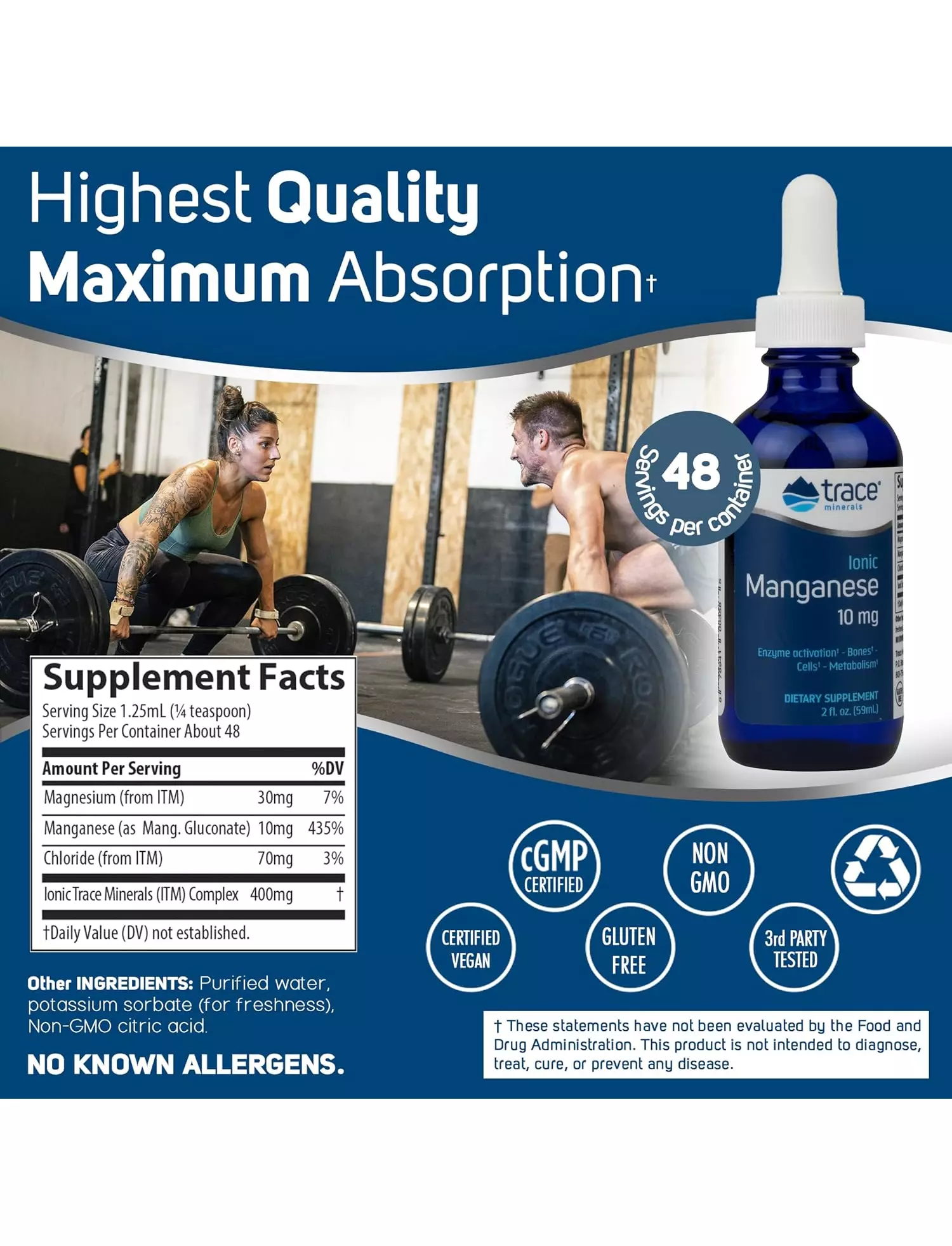 Концентрована рідка харчова добавка, яка забезпечує марганець в іонній біодоступній формі, а також повний спектр концентрованих іонних мікроелементів. Марганець необхідний для правильної активації ферментів, здорової антиоксидантної функції в клітинах, метаболізму та здорового розвитку кісток.
