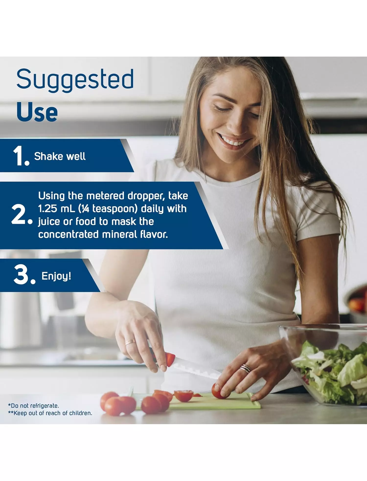 Добре струсіть. Використовуючи мірну піпетку, приймайте по 1,25 мл (1/4 чайної ложки) на день із соком або їжею, щоб замаскувати концентрований мінеральний смак.
