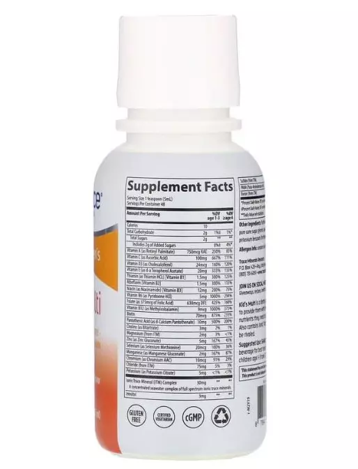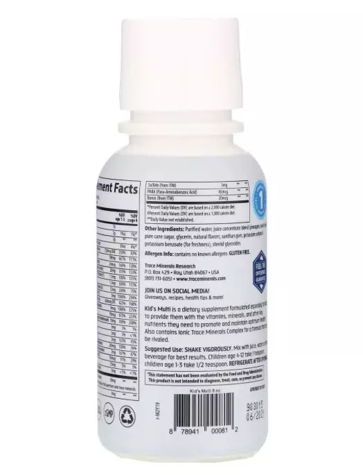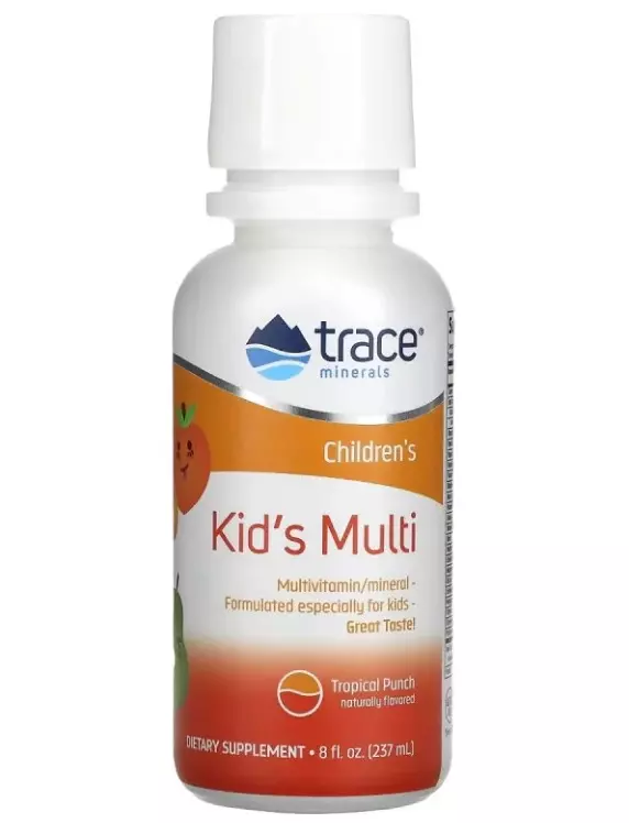 Trace Minerals Children's Multivitamin — це рідка дієтична добавка для дітей, створена з урахуванням щоденних потреб зростаючого організму. Дитячі мультивітаміни від Trace Minerals — це повноцінний комплекс вітамінів, мінералів, електролітів та іонних мікроелементів, які зміцнюють здоров’я дитини щодня. Завдяки приємному смаку тропічного пуншу та зручній рідкій формі, ця формула легко засвоюється і підходить навіть для найвибагливіших дітлахів.