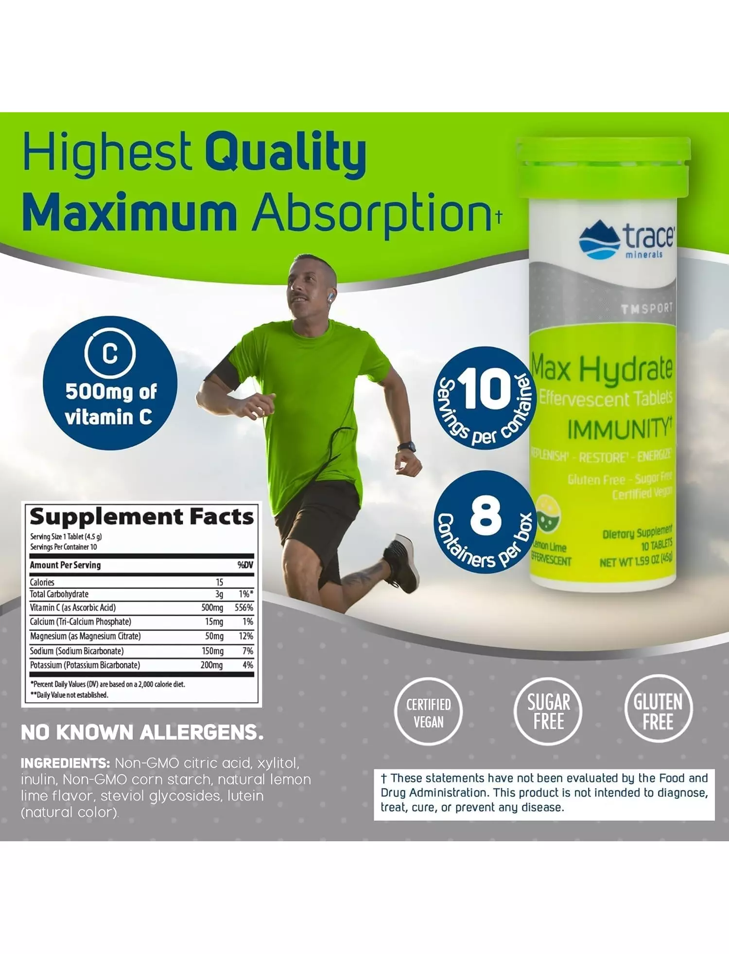 Trace Minerals Max-Hydrate Immunity — зручні шипучі таблетки, які легко перетворюють воду на смачний газований напій, що забезпечує високий рівень електролітів. Цей засіб не лише підтримує гідратацію організму, а й містить 500 мг вітаміну С для зміцнення імунної системи, допомагає уникати м’язових судом і втоми, а також сприяє загальному тонусу та енергії протягом дня.