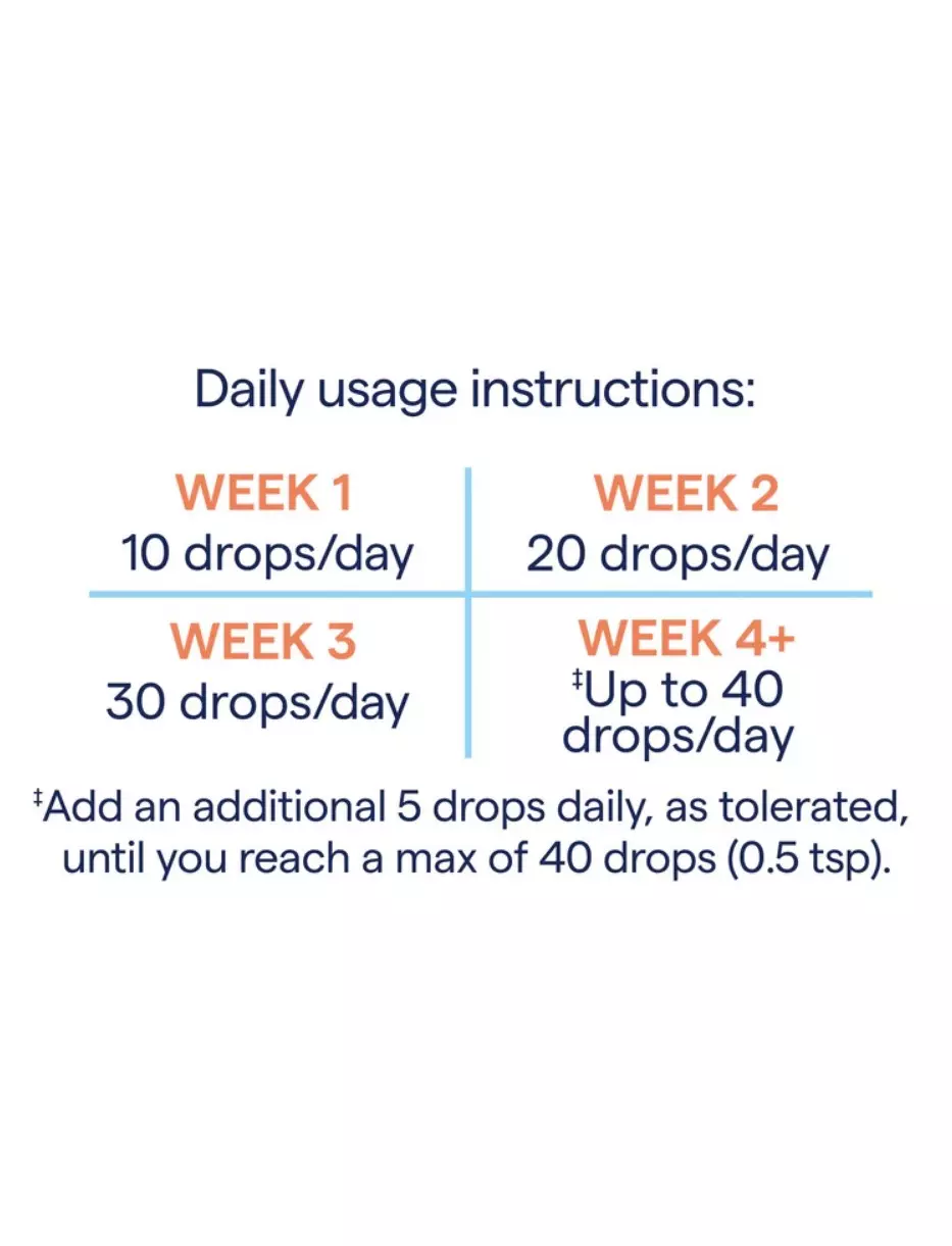 - Почніть режим з прийому 10 крапель протягом 3 днів поспіль. Щодня після цього збільшуйте порцію на 10 крапель до 1/2 чайної ложки (40 крапель) один або два рази на день.