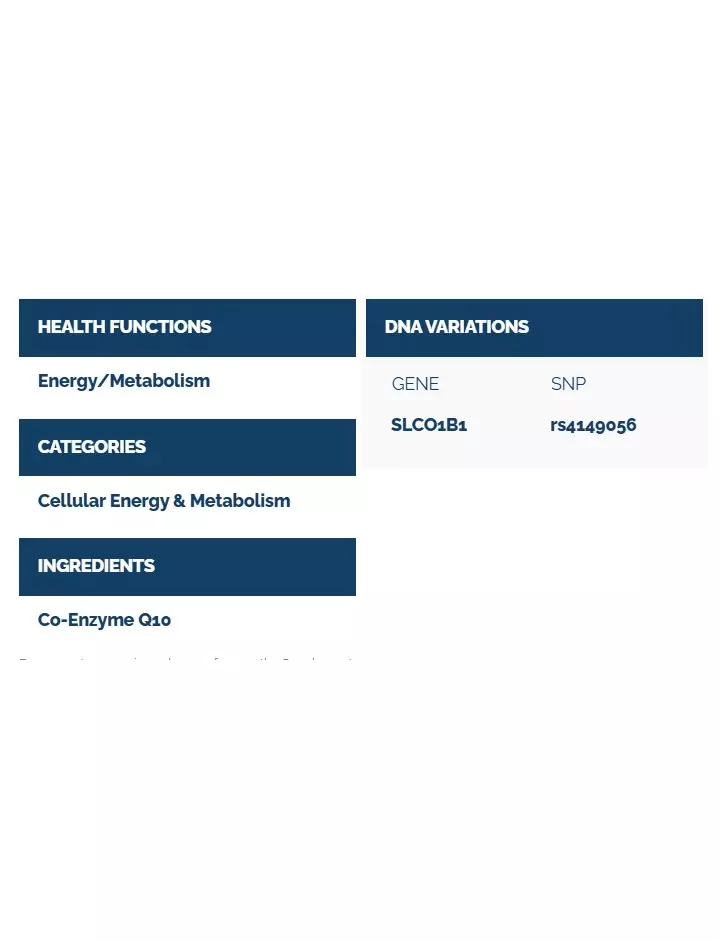 CoQ10 необхідний для вироблення клітинного АТФ (енергії) в мітохондріях. Для додаткової енергетичної підтримки розгляньте можливість додавання Mito Boost 1 та/або Mito Boost 2.