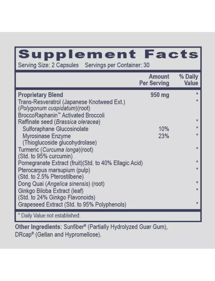 (Транс-ресвератрол (екстракт японського пташиного горця) (Polygonum cuspidatum) (корінь), активований рафінат насіння броколі BroccoRaphanin™ (Brassica oleracea), сульфорафан глюкозинолат 10%, фермент мірозинази (тіоглюкозид глюкогідролаза) 23%, куркума (Curcuma longa) (корінь) (стандартизовано до 95% куркуміну), екстракт гранату (плоди) (стандартизовано до 40% елагової кислоти), птерокарпус сумчастий (стандартизовано до 2,5% птеростильбену), дудник китайський (Angelica sinensis) (корінь), екстракт гінкго білоба (листя) (стандартизовано до 24% гінкго флавоноїди), екстракт виноградних кісточок (містить 95% поліфенолів)).
