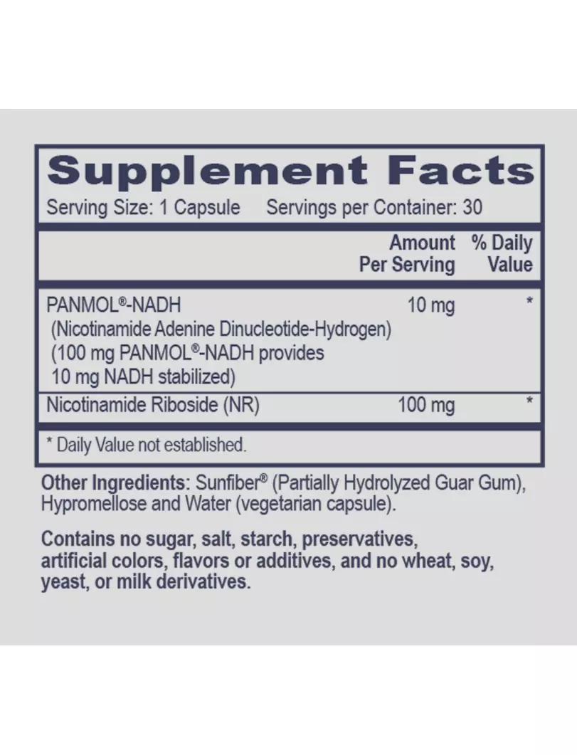 Pro NADH NR — це потужна, стабілізована форма PANMOL® Нікотинамідаденіндинуклеотиду (NADH), попередника основної біомолекули організму (NAD+), а також нікотинамід рибозид (NR), також попередник NAD+, відомий своєю здатністю безпосередньо проникати в клітину.