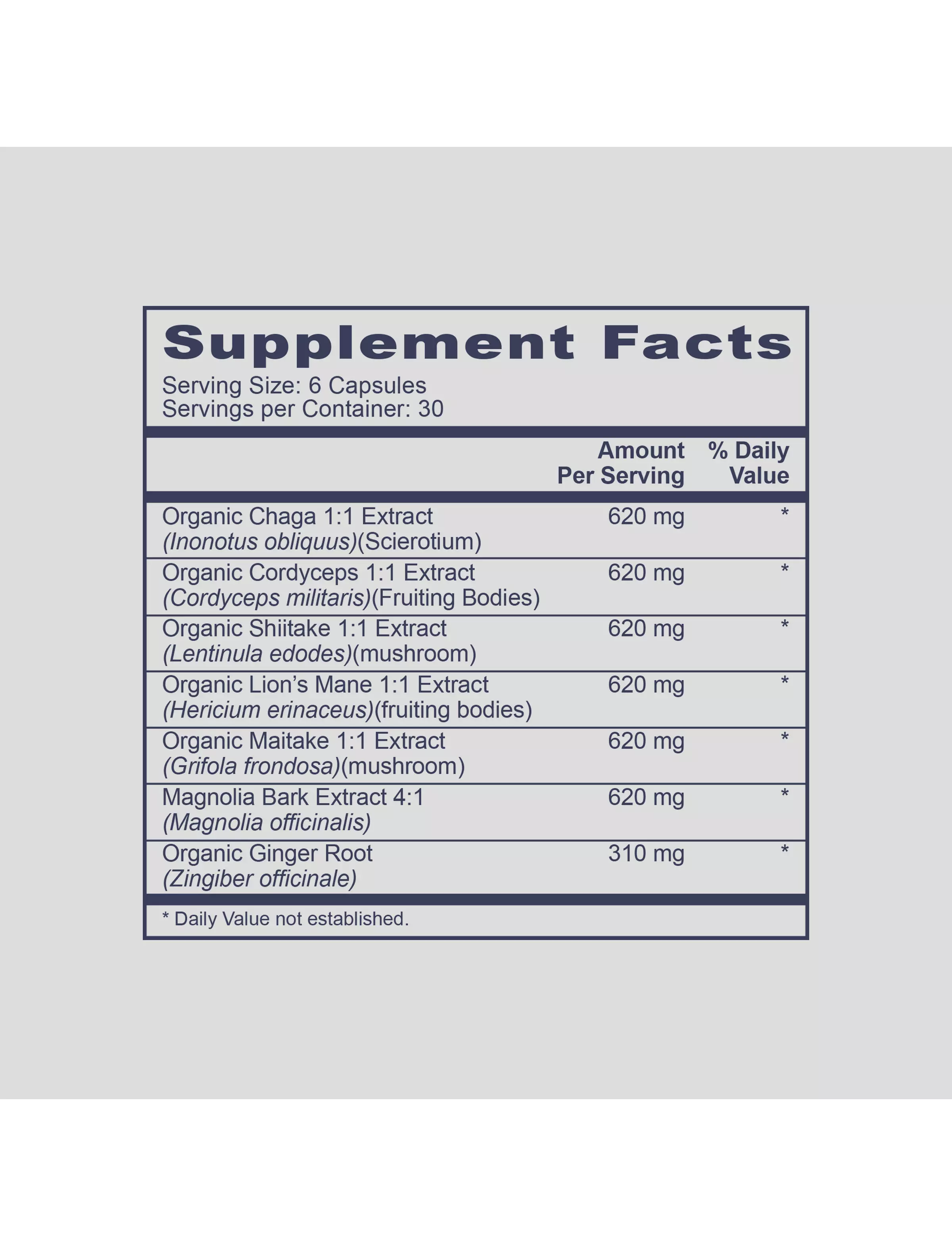 MycoPro 5 — це суміш п'яти потужних, повністю органічних і видавлених виключно за допомогою гарячої води грибів — чага, шиїтаке, майтаке, кордицепс і левова грива, а також потужних протизапальних трав — кори магнолії та імбиру.