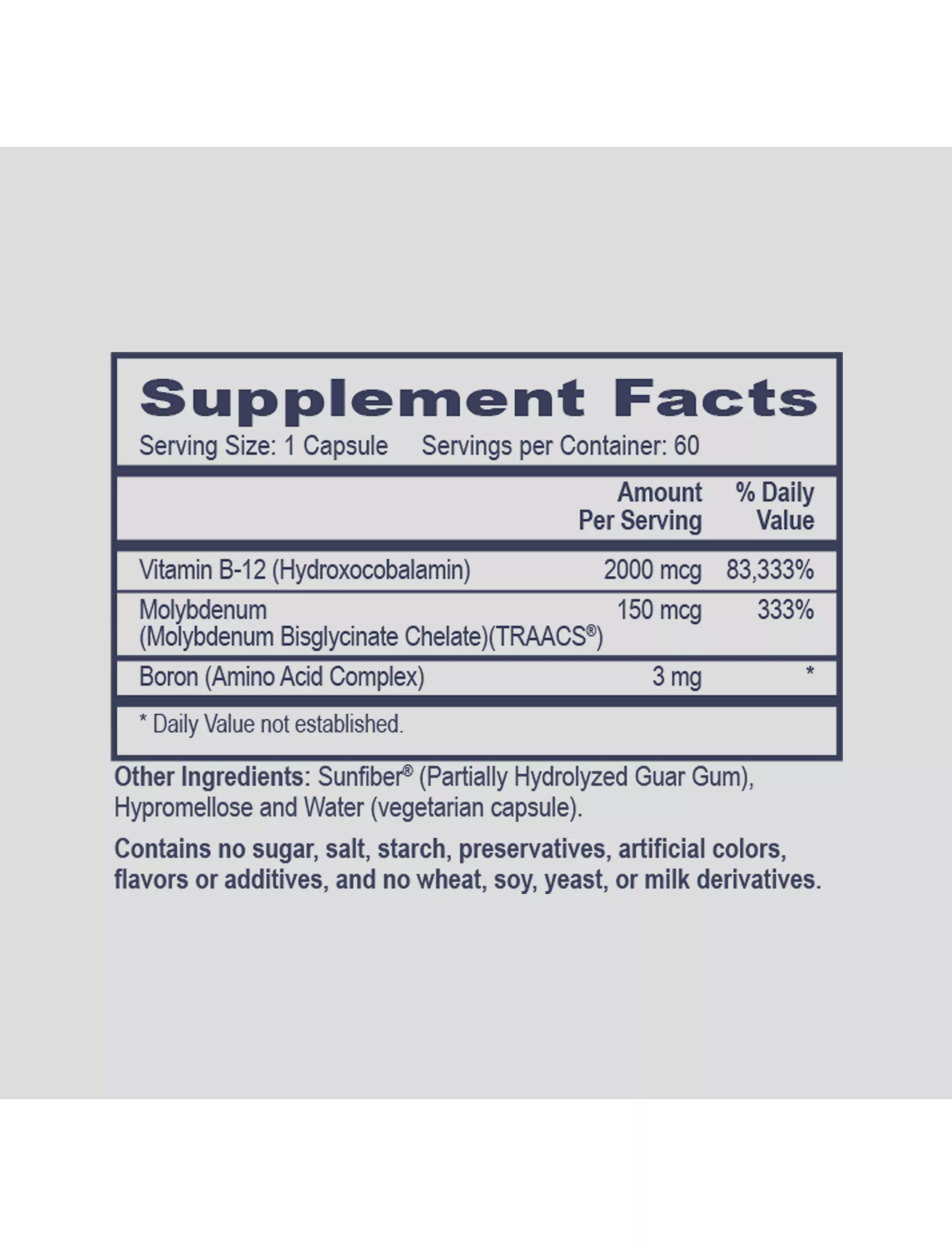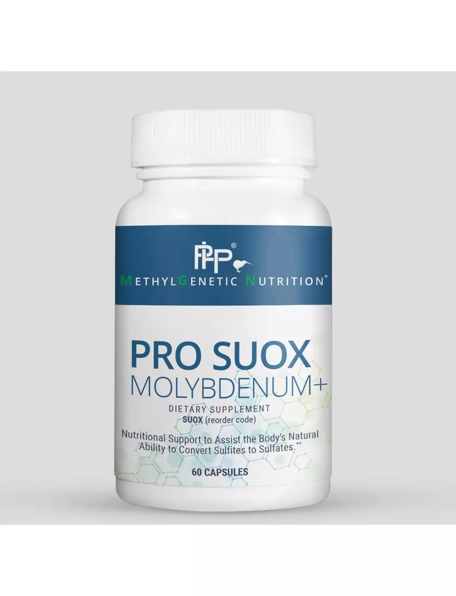 Pro SUOX (Молібден +) містить обрані поживні речовини, які підтримують фермент сульфітоксидазу (SUOX), що каталізує окислення сульфіту до сульфату — кінцеву реакцію розпаду сірковмісних амінокислот цистеїну і метіоніну.