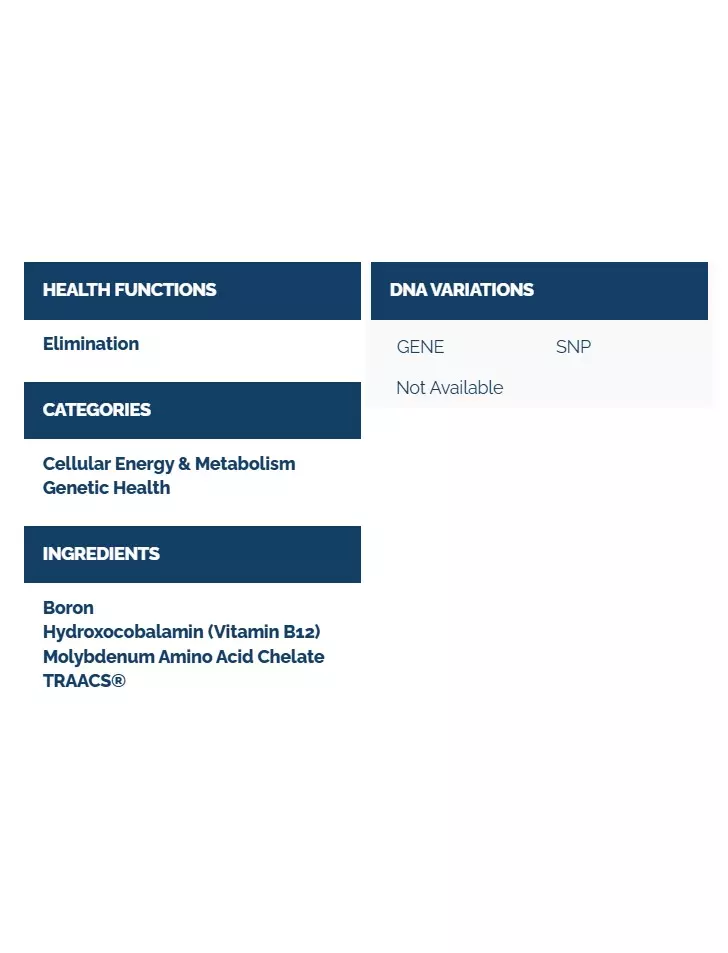 Pro SUOX сприяє перетворенню токсичних сульфітів на сульфати в організмі. Люди з генетичною варіацією SUOX схильні до більшого ризику, як і ті, хто споживає високі дози гліфосату і страждає на хронічні захворювання, оскільки надлишок сульфітів може призвести до численних негативних симптомів.