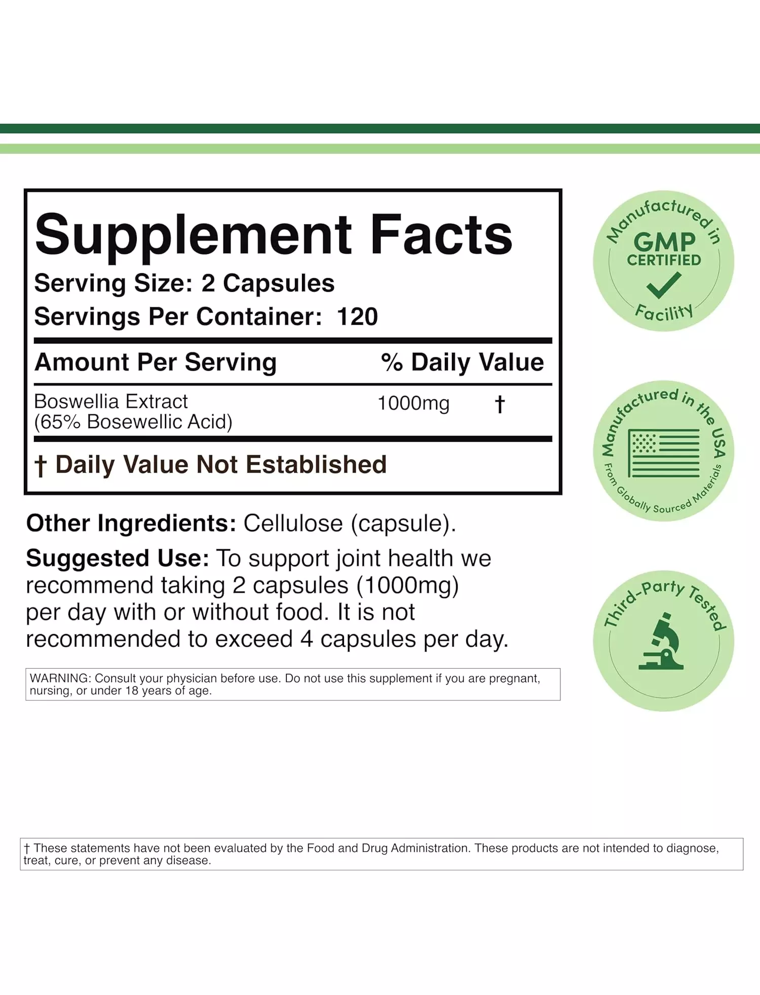кожна пляшка Босвелії містить 240 капсул та 1000 мг на дві капсули, чого достатньо для повних чотирьох місяців.