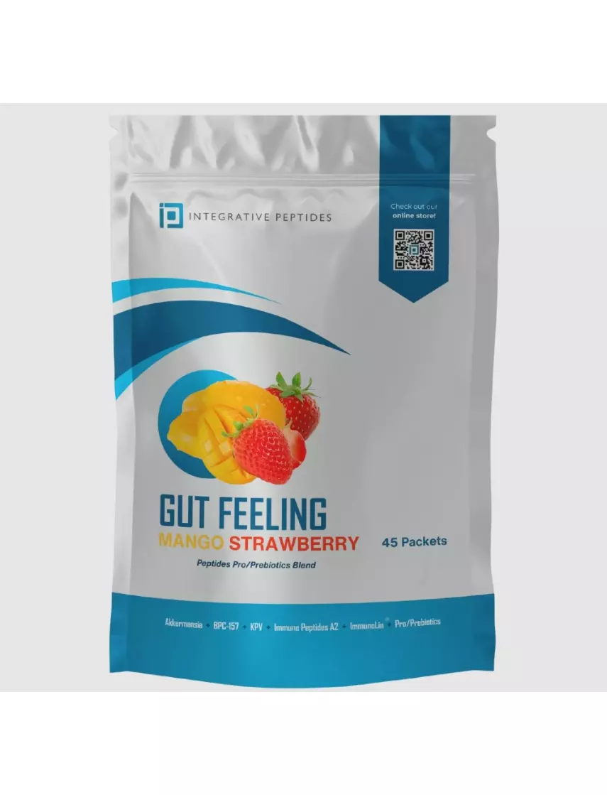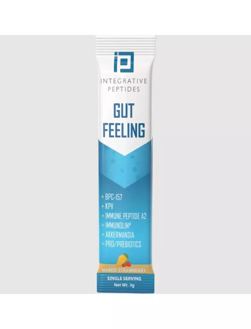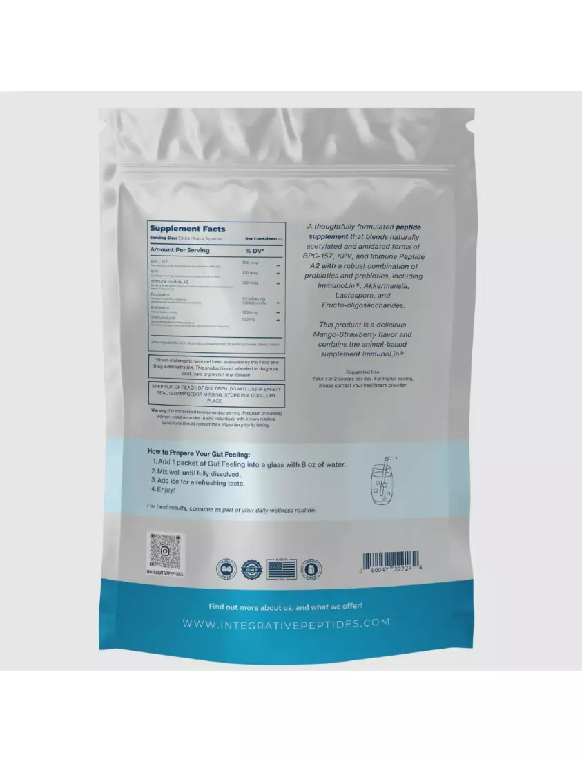 Gut Feeling — наша іноваційна суміш для напоїв для підтримки кишківника — це ретельно продумана пептидна добавка, яка поєднує в собі натуральні ацетильовані та амідовані форми BPC-157, KPV та імунного пептиду А2 з надійною комбінацією пробіотиків та пребіотиків, включаючи Immunolin (добавку тваринного походження), акермансію, лактоспору та фруктоолігосахариди.