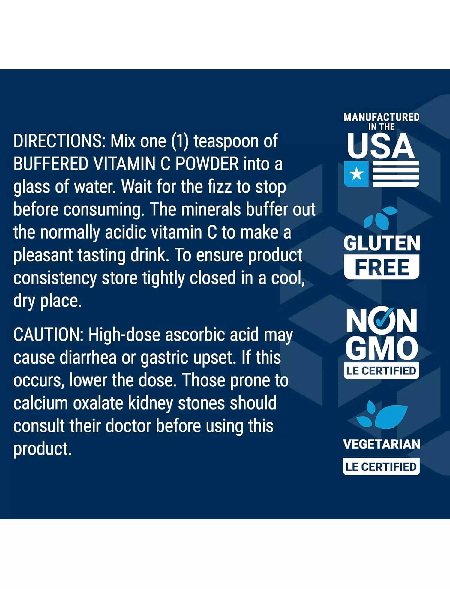 Наш буферизований порошок вітаміну С містить чотири буферні мінерали, на додаток до аскорбінової кислоти. При змішуванні з водою він утворює розчин зі зниженою кислотністю, який не дратує шлунок та слизову оболонку кишечника. Мінерали також роблять його приємнішим на смак та корисним напоєм. Речовини, які використовуються у цьому продукті, змушують його шипіти протягом короткого часу при змішуванні з водою.