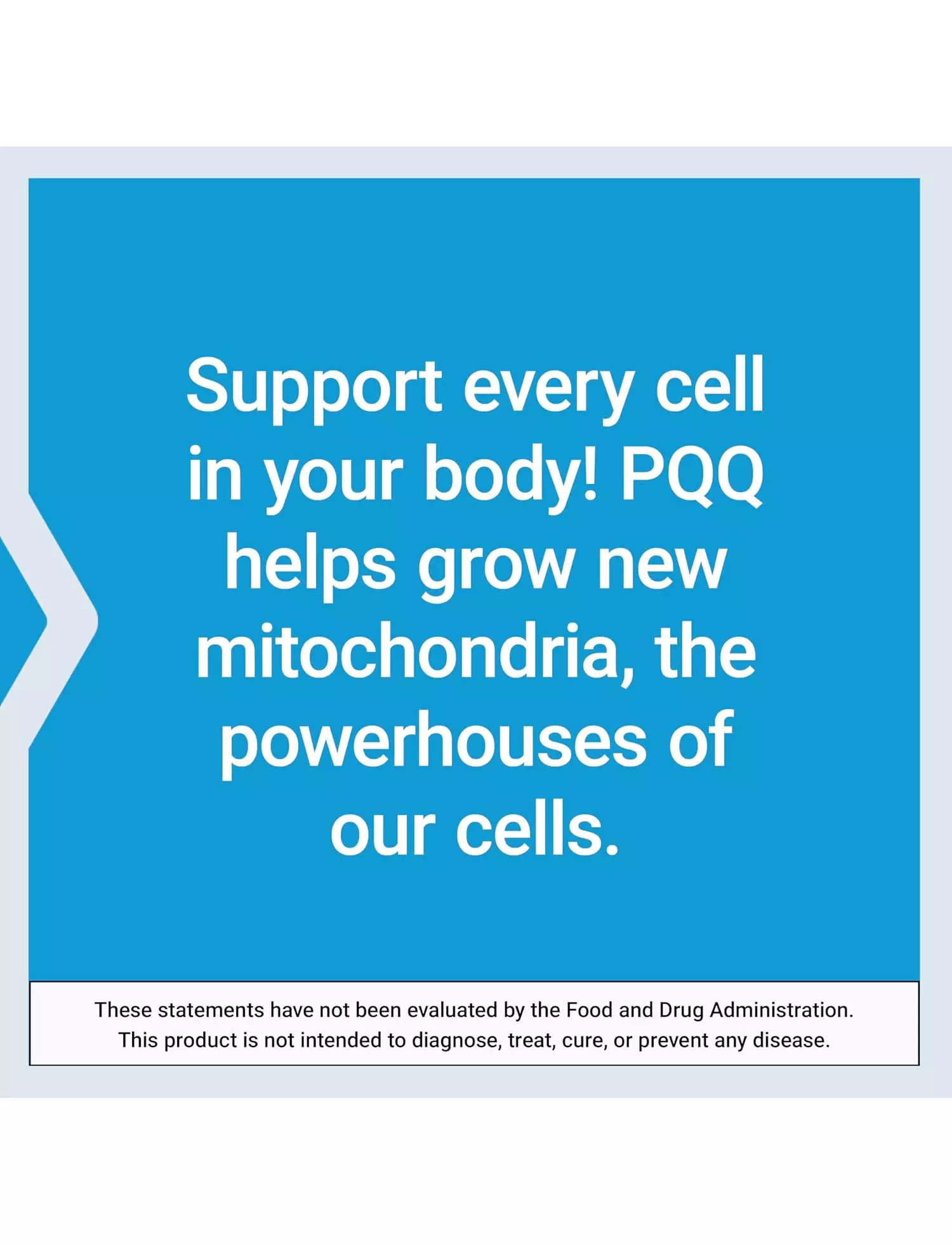 Мітохондрії забезпечують енергією клітини по всьому тілу. Але з віком кількість функціональних мітохондрій зменшується. PQQ (піролохінолінхінон) може підтримувати зростання абсолютно нових мітохондрій, які стимулюють здорову і молоду клітинну енергію для всього вашого тіла.