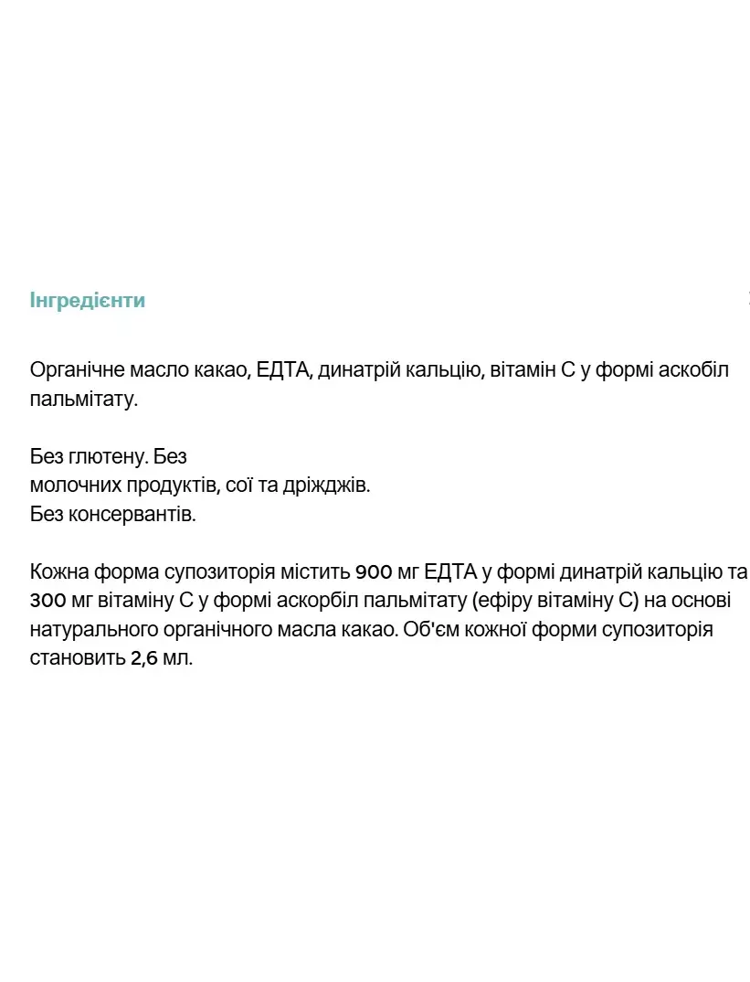 Кожна форма супозиторію містить 900 мг ЕДТА у вигляді динатрію кальцію та 300 мг вітаміну С у вигляді аскорбілпальмітату (ефіру вітаміну С) на основі натуральної органічної олії какао.
